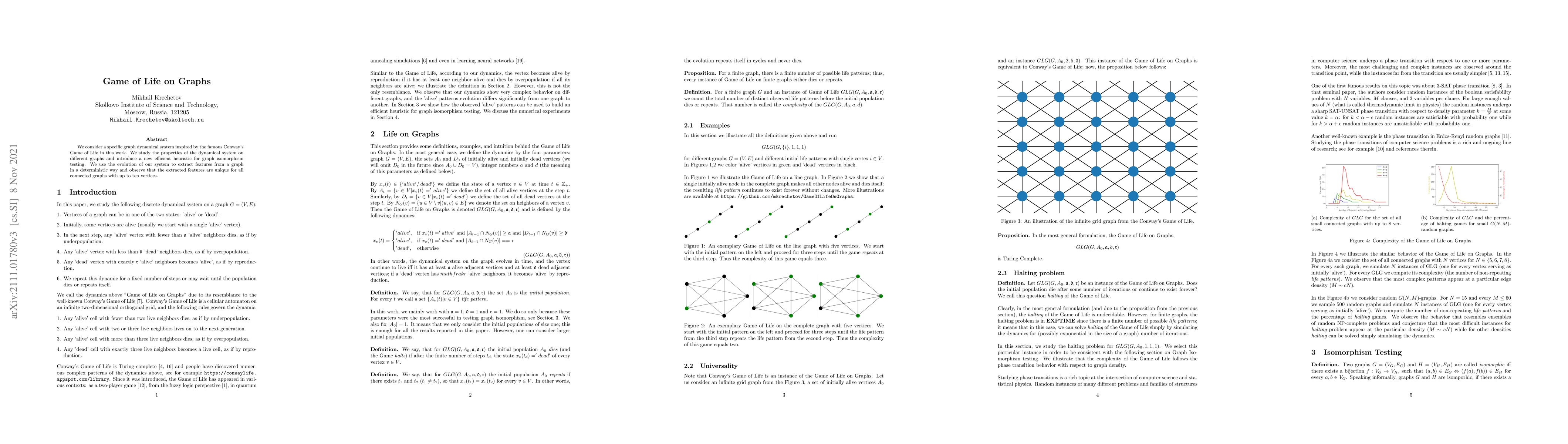We consider a specific graph dynamical system inspired by the famous Conway's Game of Life in this work. We study the properties of the dynamical system on different graphs and introduce a new efficient heuristic for graph isomorphism testing. We use the evolution of our system to extract features from a graph in a deterministic way and observe that the extracted features are unique and the distance induced by that features satisfy triangle inequality for all connected graphs with up to ten vertices.