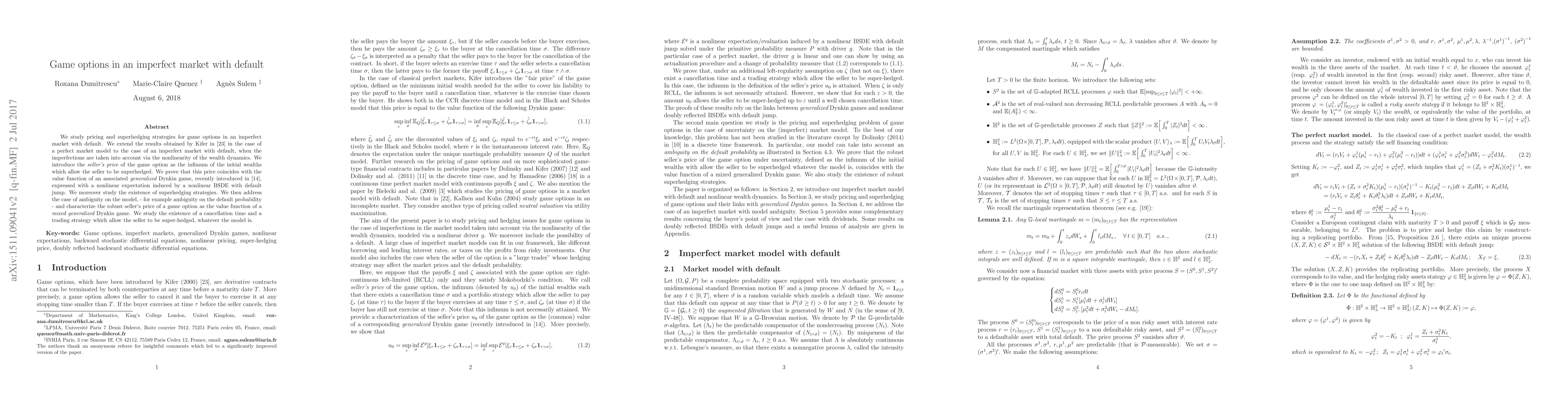 We study pricing and superhedging strategies for game options in an imperfect market with default. We extend the results obtained by Kifer in \cite{Kifer} in the case of a perfect market model to the case of an imperfect market with default, when the imperfections are taken into account via the nonlinearity of the wealth dynamics. We introduce the {\em seller's price} of the game option as the infimum of the initial wealths which allow the seller to be superhedged. We {prove} that this price coincides with the value function of an associated {\em generalized} Dynkin game, recently introduced in \cite{DQS2}, expressed with a nonlinear expectation induced by a nonlinear BSDE with default jump. We moreover study the existence of superhedging strategies. We then address the case of ambiguity on the model, - for example ambiguity on the default probability - and characterize the robust seller's price of a game option as the value function of a {\em mixed generalized} Dynkin game. We study the existence of a cancellation time and a trading strategy which allow the seller to be super-hedged, whatever the model is.