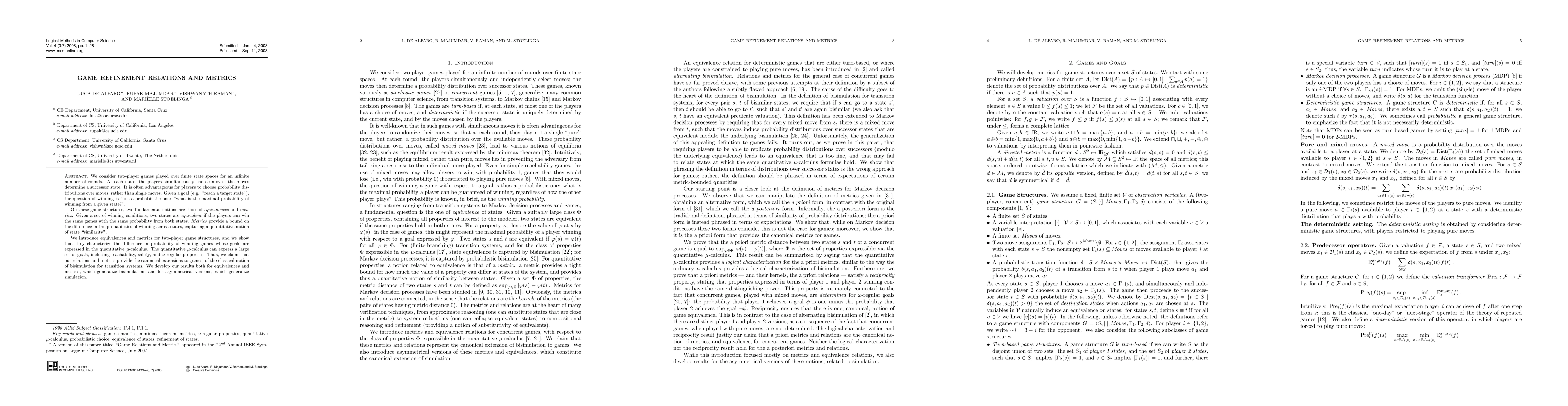 This paper introduces equivalences and metrics for two-player game structures, which provide a quantitative notion of state similarity and characterize the difference in probability of winning games expressed in the mu-calculus.