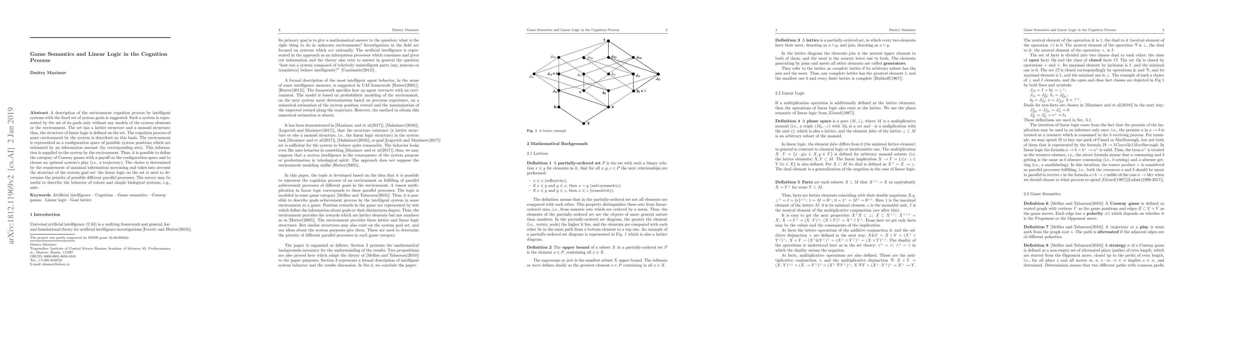 A description of the environment cognition process by intelligent systems with a fixed set of system goals is suggested. Such a system is represented by the set of its goals only without any models of the system elements or the environment. The set has a lattice structure and a monoid structure; thus, the structure of linear logic is defined on the set. The cognition process of some environment by the system is described on this basis. The environment is represented as a configuration space of possible system positions which are estimated by an information amount (by corresponding sets). This information is supplied to the system by the environment. Thus, it is possible to define the category of Conway games with a payoff on the configuration space and to choose an optimal system's play (i.e., a trajectory). The choice is determined by the requirement of maximal information increasing and takes into account the structure of the system goal set: the linear logic on the set is used to determine the priority of possible different parallel processes. The survey may be useful to describe the behavior of robots and simple biological systems, e.g., ants.