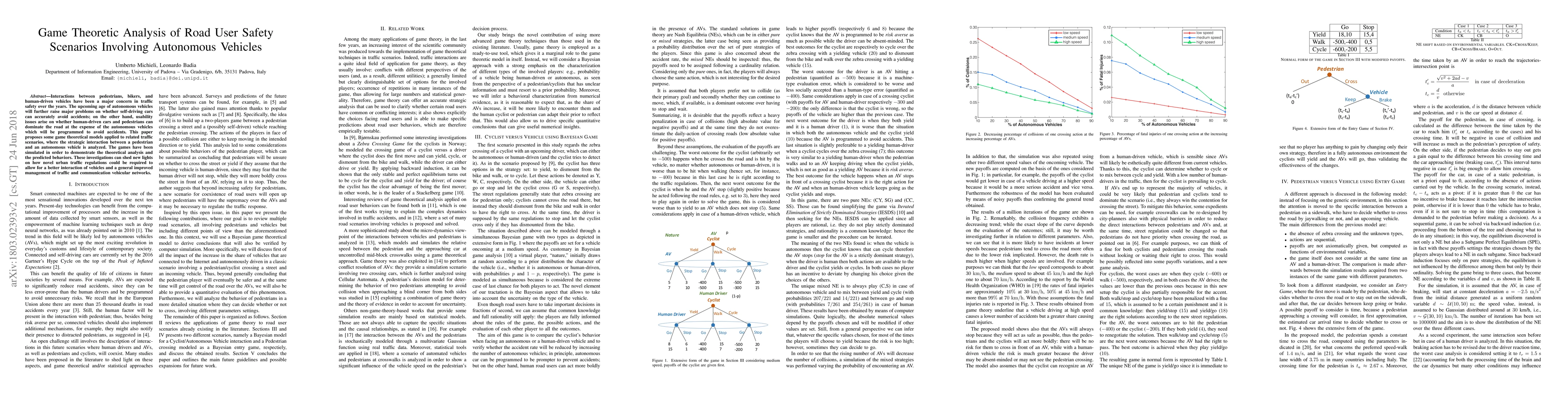 Interactions between pedestrians, bikers, and human-driven vehicles have been a major concern in traffic safety over the years. The upcoming age of autonomous vehicles will further raise major problems on whether self-driving cars can accurately avoid accidents; on the other hand, usability issues arise on whether human-driven cars and pedestrians can dominate the road at the expense of the autonomous vehicles which will be programmed to avoid accidents. This paper proposes some game theoretical models applied to related traffic scenarios. In the first two games the reciprocal influence between a pedestrian and a vehicle (either autonomous or not) is analyzed, while the third game investigates the intersection of two vehicles, possibly autonomous. The games have been simulated in order to demonstrate the theoretical analysis and the predicted behaviors. These investigations can shed new lights on how novel urban traffic regulations could be required to allow for a better interaction of vehicles and a general improved management of traffic and communication vehicular networks.