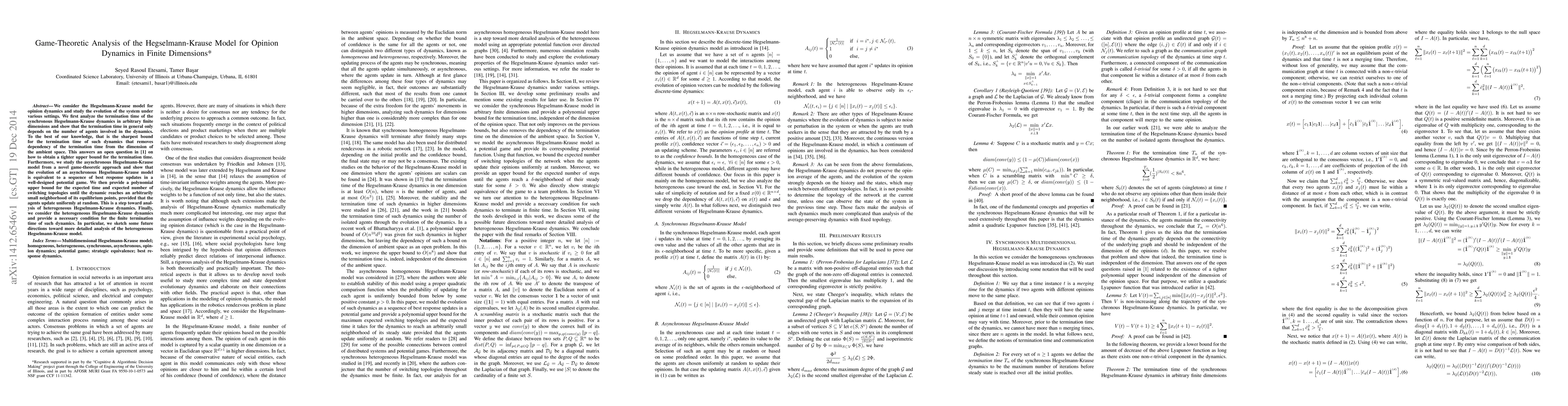 We consider the Hegselmann-Krause model for opinion dynamics and study the evolution of the system under various settings. We first analyze the termination time of the synchronous Hegselmann-Krause dynamics in arbitrary finite dimensions and show that the termination time in general only depends on the number of agents involved in the dynamics. To the best of our knowledge, that is the sharpest bound for the termination time of such dynamics that removes dependency of the termination time from the dimension of the ambient space. This answers an open question in [1] on how to obtain a tighter upper bound for the termination time. Furthermore, we study the asynchronous Hegselmann-Krause model from a novel game-theoretic approach and show that the evolution of an asynchronous Hegselmann-Krause model is equivalent to a sequence of best response updates in a well-designed potential game. We then provide a polynomial upper bound for the expected time and expected number of switching topologies until the dynamic reaches an arbitrarily small neighborhood of its equilibrium points, provided that the agents update uniformly at random. This is a step toward analysis of heterogeneous Hegselmann-Krause dynamics. Finally, we consider the heterogeneous Hegselmann-Krause dynamics and provide a necessary condition for the finite termination time of such dynamics. In particular, we sketch some future directions toward more detailed analysis of the heterogeneous Hegselmann-Krause model.