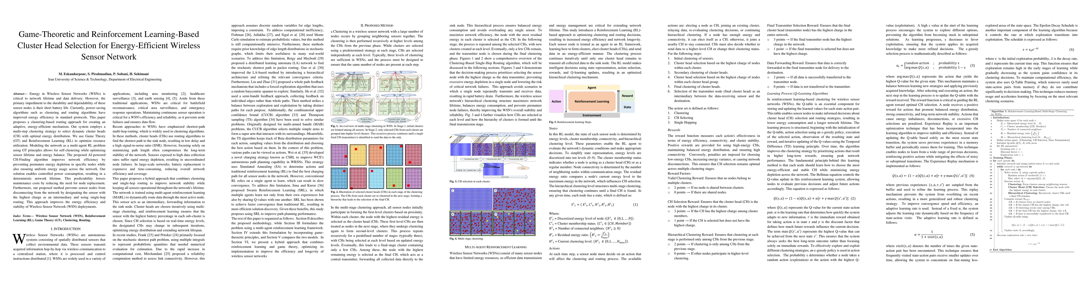 Energy in Wireless Sensor Networks (WSNs) is critical to network lifetime and data delivery. However, the primary impediment to the durability and dependability of these sensor nodes is their short battery life. Currently, power-saving algorithms such as clustering and routing algorithms have improved energy efficiency in standard protocols. This paper proposes a clustering-based routing approach for creating an adaptive, energy-efficient mechanism. Our system employs a multi-step clustering strategy to select dynamic cluster heads (CH) with optimal energy distribution. We use Game Theory (GT) and Reinforcement Learning (RL) to optimize resource utilization. Modeling the network as a multi-agent RL problem using GT principles allows for self-clustering while optimizing sensor lifetime and energy balance. The proposed AI-powered CH-Finding algorithm improves network efficiency by preventing premature energy depletion in specific nodes while also ensuring uniform energy usage across the network. Our solution enables controlled power consumption, resulting in a deterministic network lifetime. This predictability lowers maintenance costs by reducing the need for node replacement. Furthermore, our proposed method prevents sensor nodes from disconnecting from the network by designating the sensor with the highest charge as an intermediary and using single-hop routing. This approach improves the energy efficiency and stability of Wireless Sensor Network (WSN) deployments.