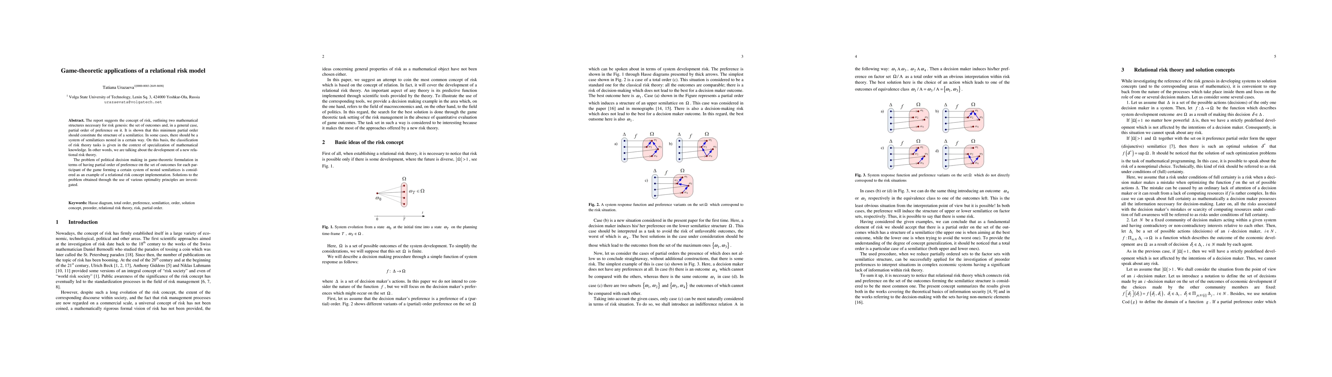 The report suggests the concept of risk, outlining two mathematical structures necessary for risk genesis: the set of outcomes and, in a general case, partial order of preference on it. It is shown that this minimum partial order should constitute the structure of a semilattice. In some cases, there should be a system of semilattices nested in a certain way. On this basis, the classification of risk theory tasks is given in the context of specialization of mathematical knowledge. In other words, we are talking about the development of a new rela-tional risk theory. The problem of political decision making in game-theoretic formulation in terms of having partial order of preference on the set of outcomes for each par-ticipant of the game forming a certain system of nested semilattices is consid-ered as an example of a relational risk concept implementation. Solutions to the problem obtained through the use of various optimality principles are investi-gated.
