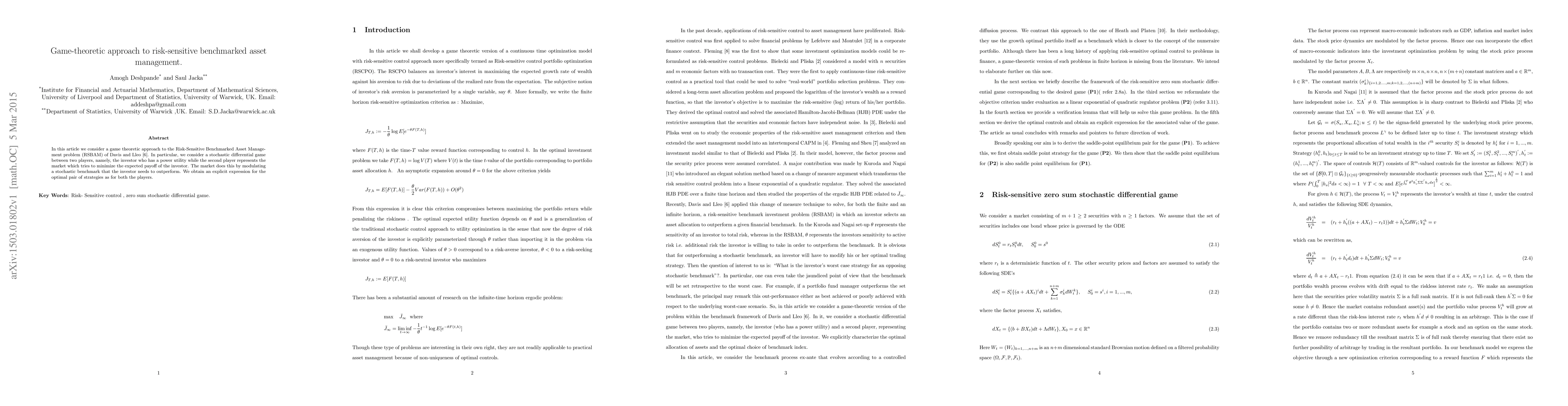 This paper employs a game-theoretic framework to address the Risk-Sensitive Benchmarked Asset Management problem, where an investor with power utility aims to outperform a stochastic benchmark modulated by the market, which seeks to minimize the investor's expected payoff. The authors derive an explicit expression for the optimal strategy pair for both the investor and the market.