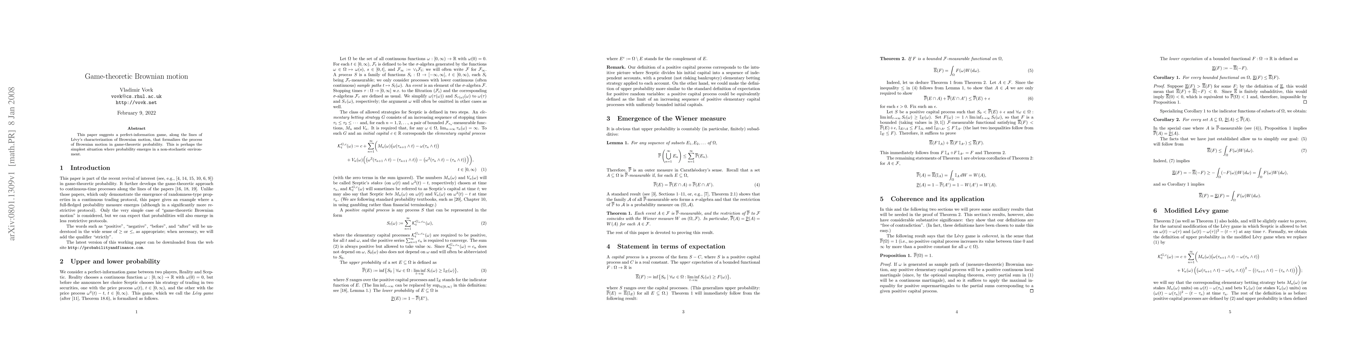 The paper introduces a game-theoretic framework for Brownian motion, utilizing Levy's characterization to formalize the process in a non-stochastic environment through a perfect-information game.