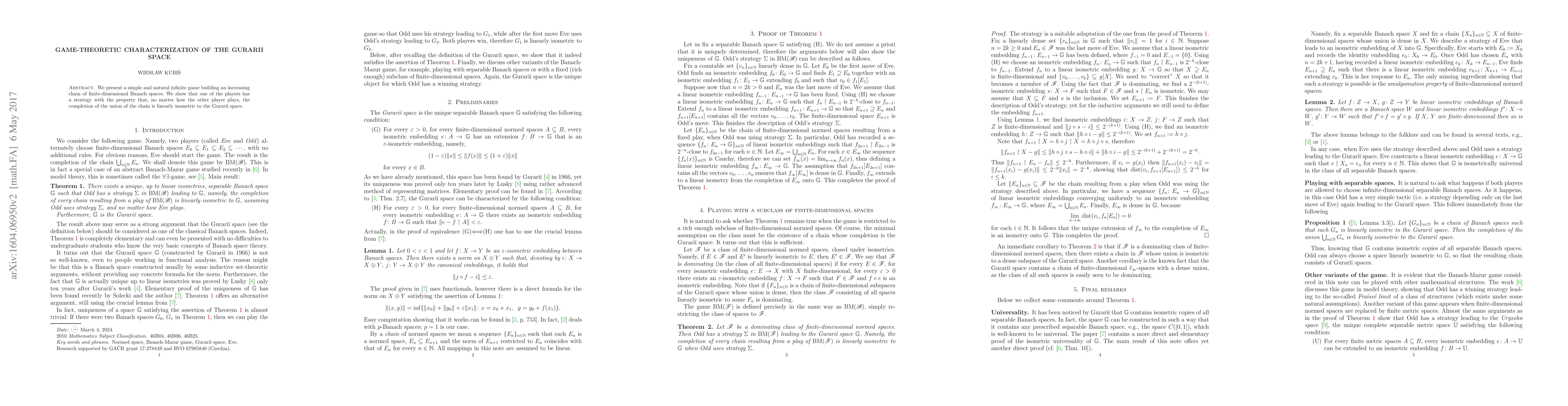 This paper introduces a game-theoretic approach to characterize the Gurarii space by constructing an infinite game that builds a sequence of finite-dimensional Banach spaces, demonstrating that one player's strategy guarantees the completion of the union is isometric to the Gurarii space regardless of the other player's actions.