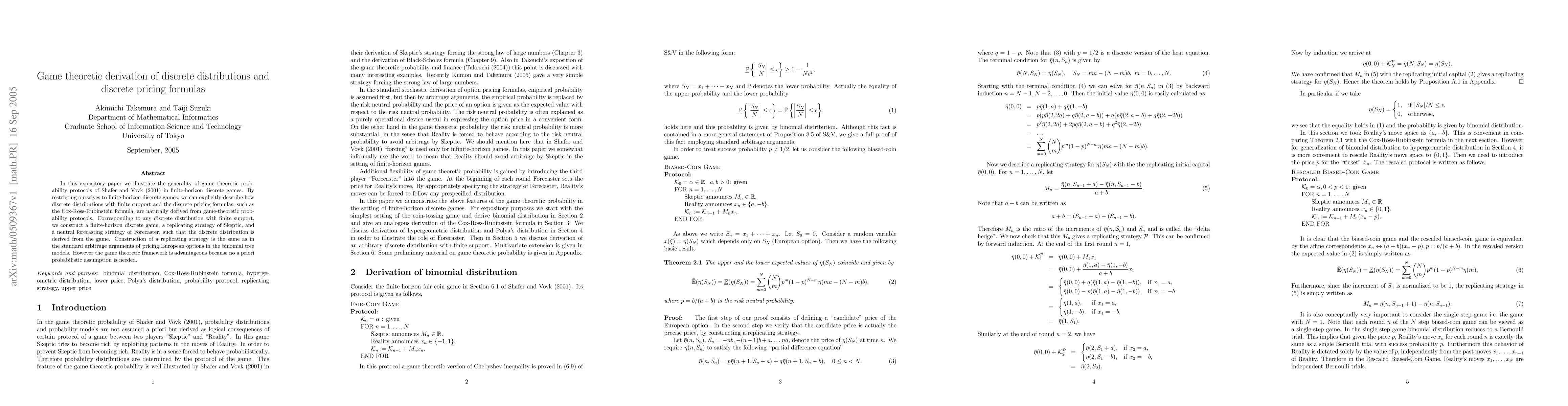 This paper demonstrates how game-theoretic probability protocols can derive discrete distributions and pricing formulas in finite-horizon discrete games without requiring a priori probabilistic assumptions. It constructs finite-horizon games to naturally produce discrete distributions and pricing formulas like the Cox-Ross-Rubinstein formula.