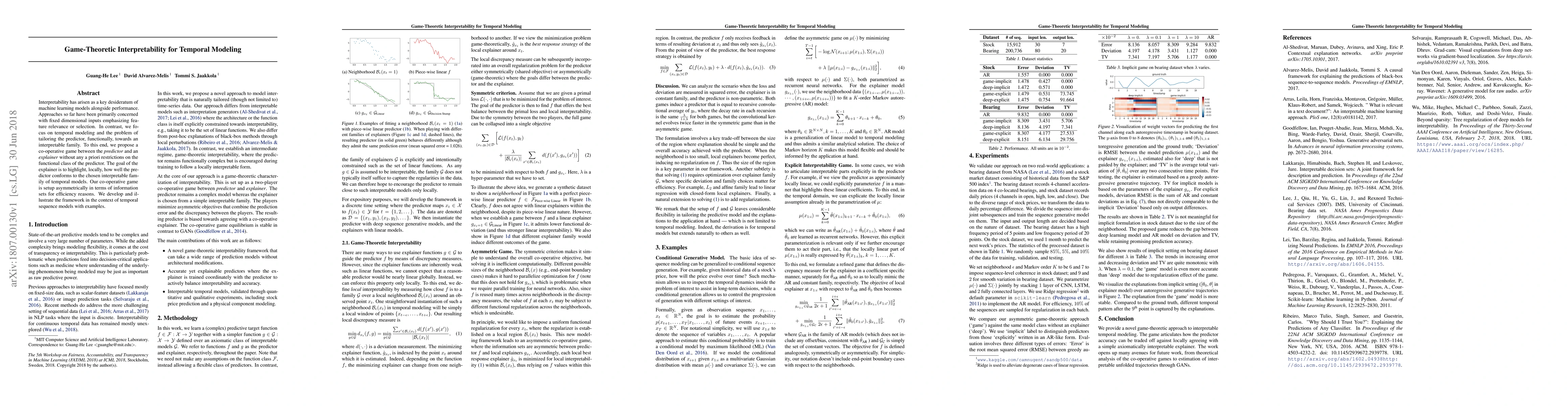 This paper proposes a game-theoretic framework for enhancing interpretability in temporal modeling by introducing a cooperative game between a predictor and an explainer, focusing on how well the predictor fits an interpretable family of temporal models without restricting the predictor's functional class. The game is designed asymmetrically for efficiency and is demonstrated through examples of temporal sequence models.