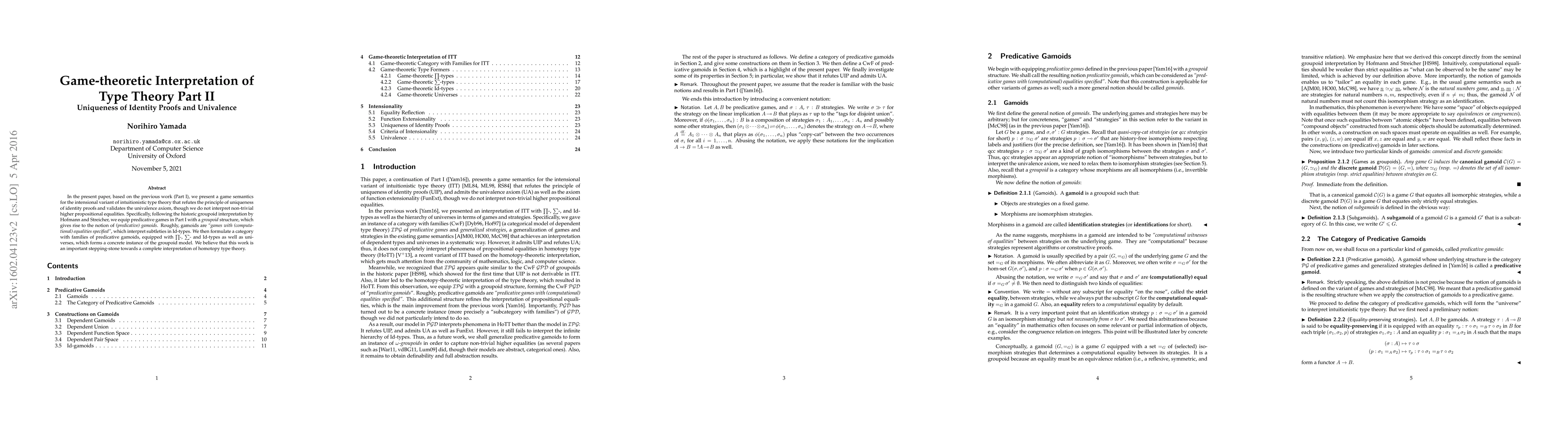 In the present paper, based on the previous work (Part I), we present a game semantics for the intensional variant of intuitionistic type theory that refutes the principle of uniqueness of identity proofs and validates the univalence axiom, though we do not interpret non-trivial higher propositional equalities. Specifically, following the historic groupoid interpretation by Hofmann and Streicher, we equip predicative games in Part I with a groupoid structure, which gives rise to the notion of (predicative) gamoids. Roughly, gamoids are "games with (computational) equalities specified", which interpret subtleties in Id-types. We then formulate a category with families of predicative gamoids, equipped with dependent product, dependent sum, and Id-types as well as universes, which forms a concrete instance of the groupoid model. We believe that this work is an important stepping-stone towards a complete interpretation of homotopy type theory.