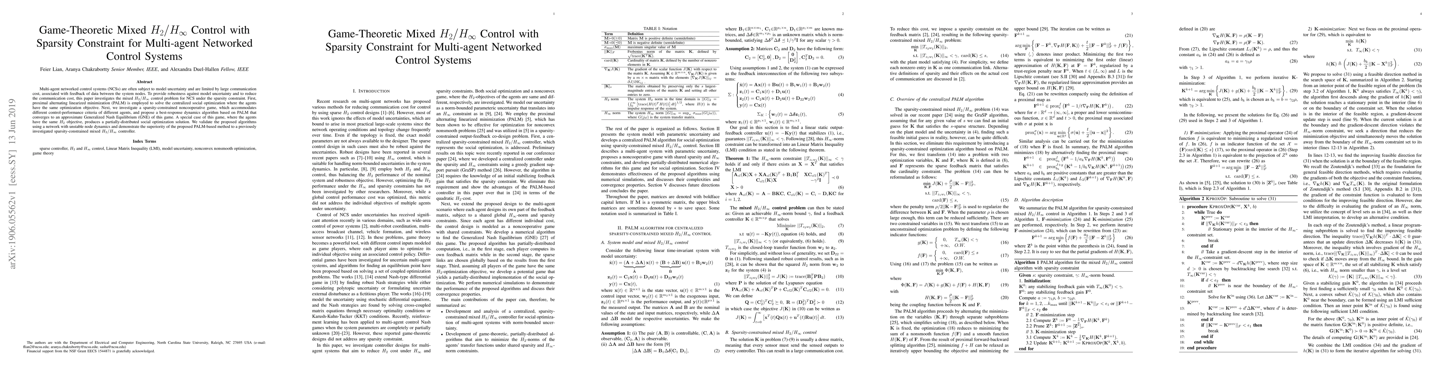 Multi-agent networked control systems (NCSs) are often subject to model uncertainty and are limited by large communication cost, associated with feedback of data between the system nodes. To provide robustness against model uncertainty and to reduce the communication cost, this paper investigates the mixed $H_2/H_{\infty}$ control problem for NCS under the sparsity constraint. First, proximal alternating linearized minimization (PALM) is employed to solve the centralized social optimization where the agents have the same optimization objective. Next, we investigate a sparsity-constrained noncooperative game, which accommodates different control-performance criteria of different agents, and propose a best-response dynamics algorithm based on PALM that converges to an approximate Generalized Nash Equilibrium (GNE) of this game. A special case of this game, where the agents have the same $H_2$ objective, produces a partially-distributed social optimization solution. We validate the proposed algorithms using a network with unstable node dynamics and demonstrate the superiority of the proposed PALM-based method to a previously investigated sparsity-constrained mixed $H_2/H_{\infty}$ controller.