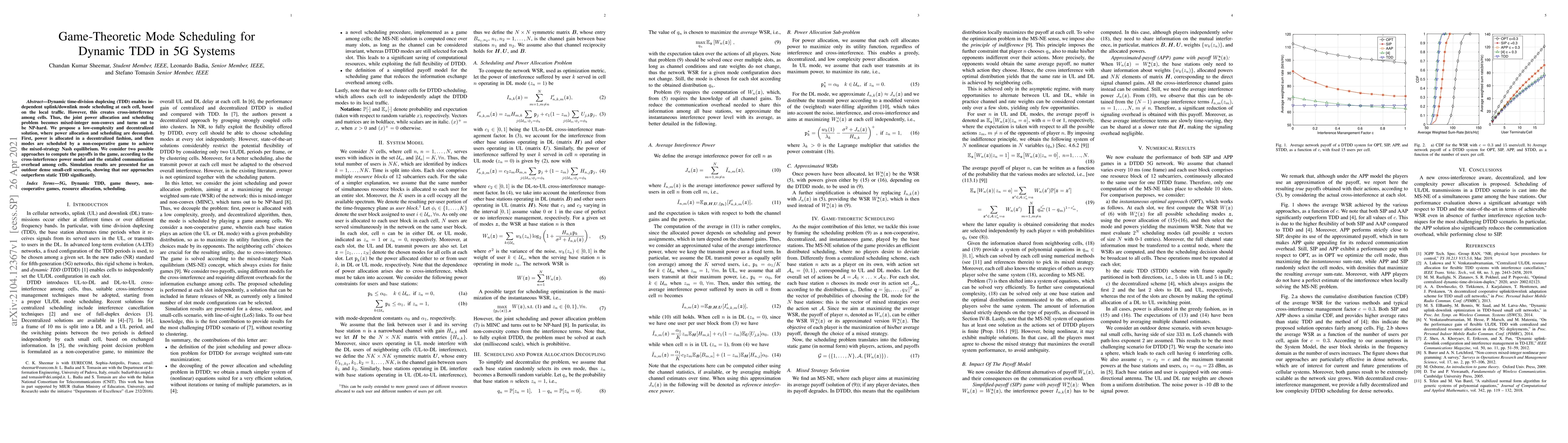 This paper proposes a game-theoretic approach for dynamic TDD mode scheduling in 5G systems to mitigate cross-interference among cells. It decouples power allocation and scheduling in a decentralized manner, achieving a mixed-strategy Nash equilibrium through non-cooperative game theory, with simulation results showing significant performance gains over static TDD.