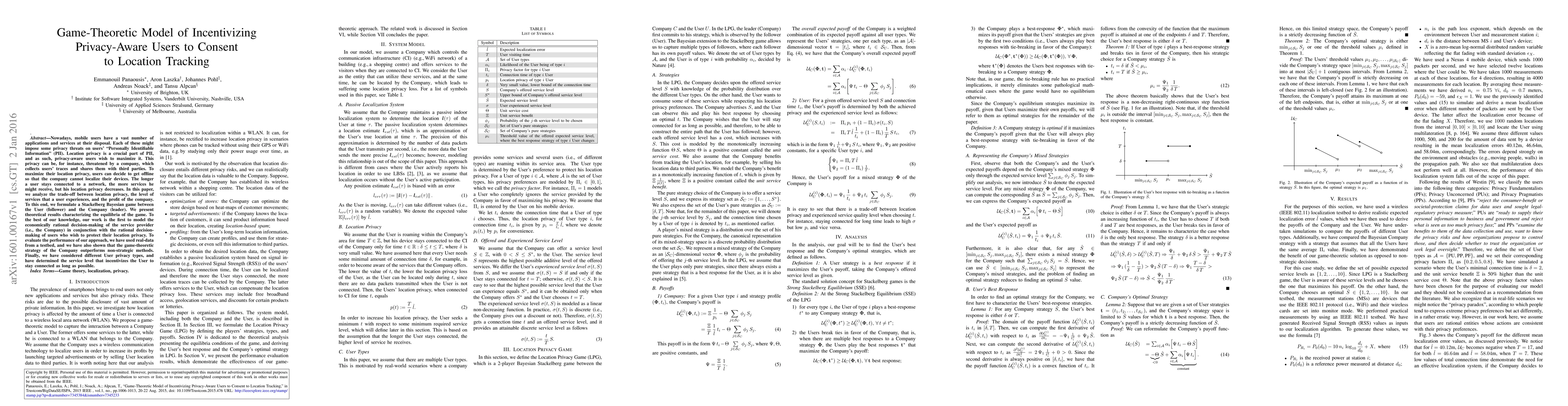 Nowadays, mobile users have a vast number of applications and services at their disposal. Each of these might impose some privacy threats on users' "Personally Identifiable Information" (PII). Location privacy is a crucial part of PII, and as such, privacy-aware users wish to maximize it. This privacy can be, for instance, threatened by a company, which collects users' traces and shares them with third parties. To maximize their location privacy, users can decide to get offline so that the company cannot localize their devices. The longer a user stays connected to a network, the more services he might receive, but his location privacy decreases. In this paper, we analyze the trade-off between location privacy, the level of services that a user experiences, and the profit of the company. To this end, we formulate a Stackelberg Bayesian game between the User (follower) and the Company (leader). We present theoretical results characterizing the equilibria of the game. To the best of our knowledge, our work is the first to model the economically rational decision-making of the service provider (i.e., the Company) in conjunction with the rational decision-making of users who wish to protect their location privacy. To evaluate the performance of our approach, we have used real-data from a testbed, and we have also shown that the game-theoretic strategy of the Company outperforms non-strategic methods. Finally, we have considered different User privacy types, and have determined the service level that incentivizes the User to stay connected as long as possible.