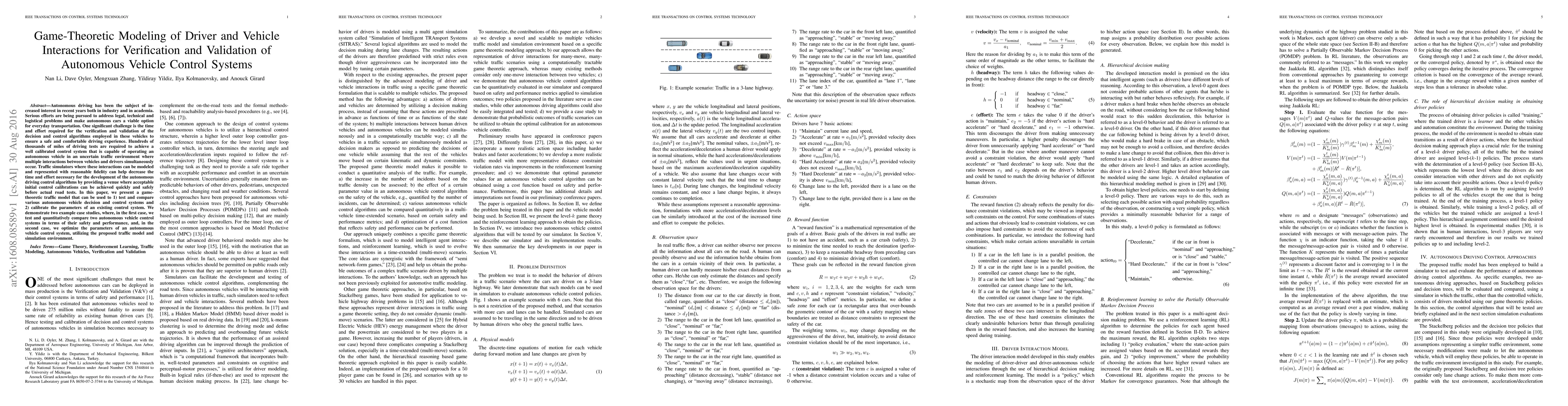 This paper introduces a game-theoretic model to simulate driver and vehicle interactions for verifying and validating autonomous vehicle control systems. It demonstrates the model's use in comparing control systems for safety and performance, and optimizing control parameters through simulation.