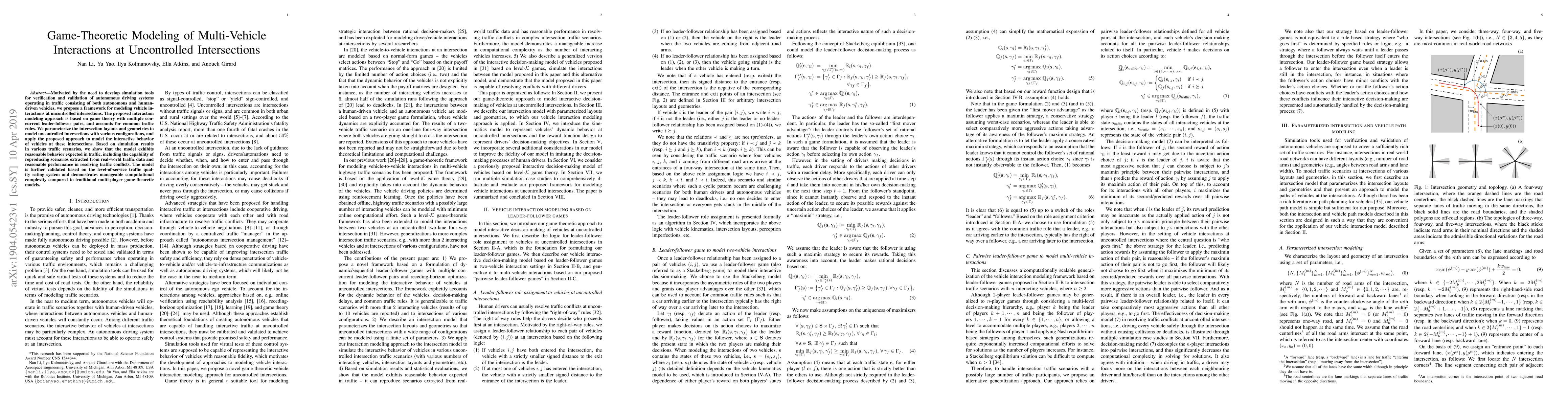 This paper proposes a game-theoretic framework for modeling multi-vehicle interactions at uncontrolled intersections, incorporating leader-follower dynamics and common traffic rules. The model is validated through simulations and shows reasonable behavior, effective conflict resolution, and manageable computational complexity.