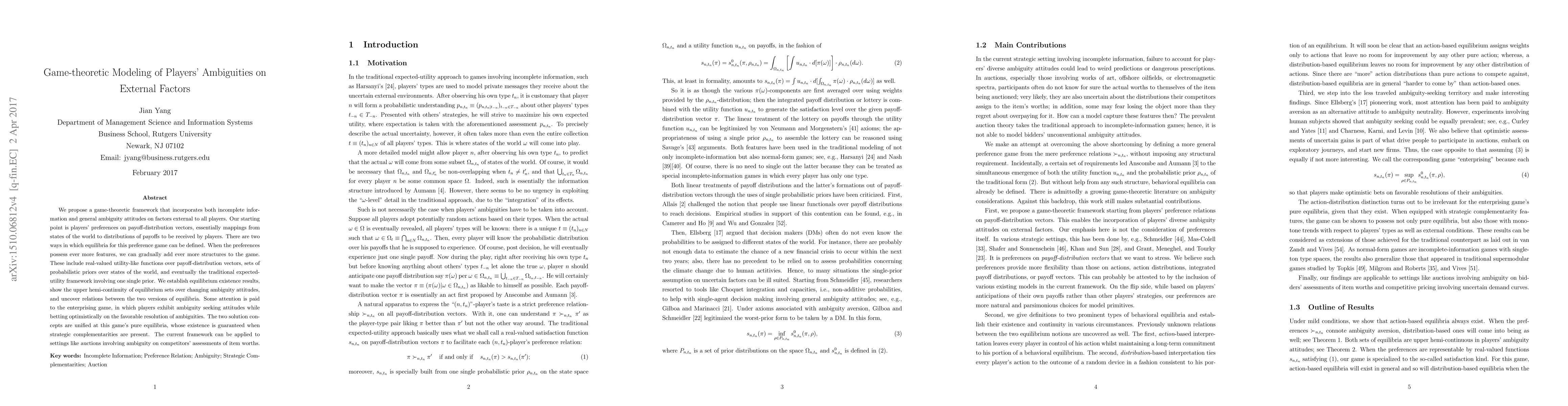 We propose a game-theoretic framework that incorporates both incomplete information and general ambiguity attitudes on factors external to all players. Our starting point is players' preferences on payoff-distribution vectors, essentially mappings from states of the world to distributions of payoffs to be received by players. There are two ways in which equilibria for this preference game can be defined. When the preferences possess ever more features, we can gradually add ever more structures to the game. These include real-valued utility-like functions over payoff-distribution vectors, sets of probabilistic priors over states of the world, and eventually the traditional expected-utility framework involving one single prior. We establish equilibrium existence results, show the upper hemi-continuity of equilibrium sets over changing ambiguity attitudes, and uncover relations between the two versions of equilibria. Some attention is paid to the enterprising game, in which players exhibit ambiguity seeking attitudes while betting optimistically on the favorable resolution of ambiguities. The two solution concepts are unified at this game's pure equilibria, whose existence is guaranteed when strategic complementarities are present. The current framework can be applied to settings like auctions involving ambiguity on competitors' assessments of item worths.