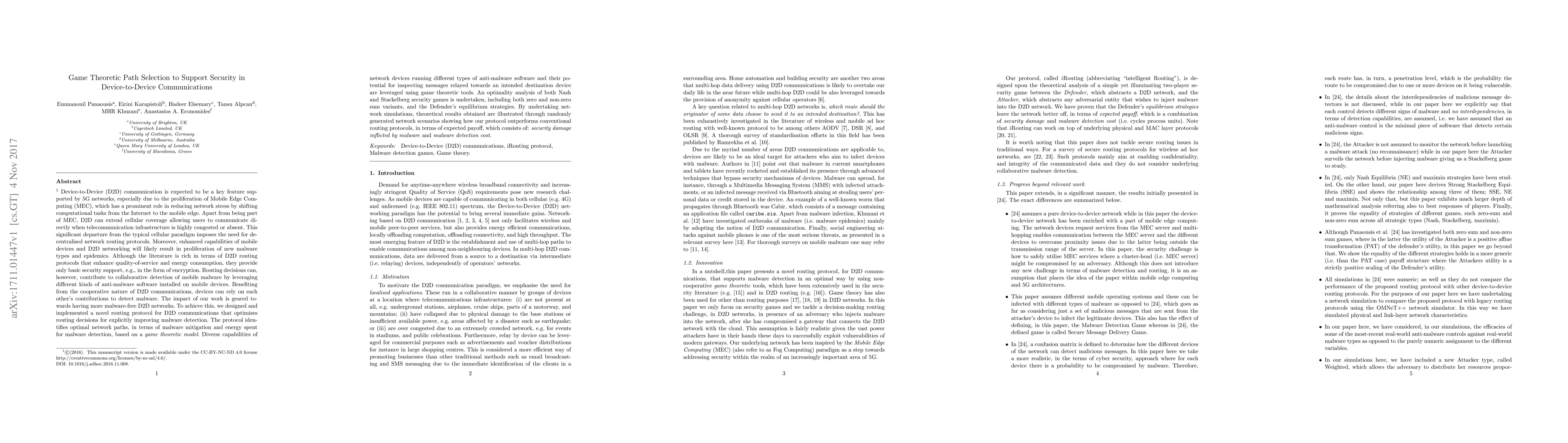 This paper proposes a novel game theoretic routing protocol for Device-to-Device (D2D) communications to enhance malware detection. The protocol optimizes network paths to balance security and energy efficiency, leveraging anti-malware software on devices, and demonstrates superior performance over conventional protocols in simulations.