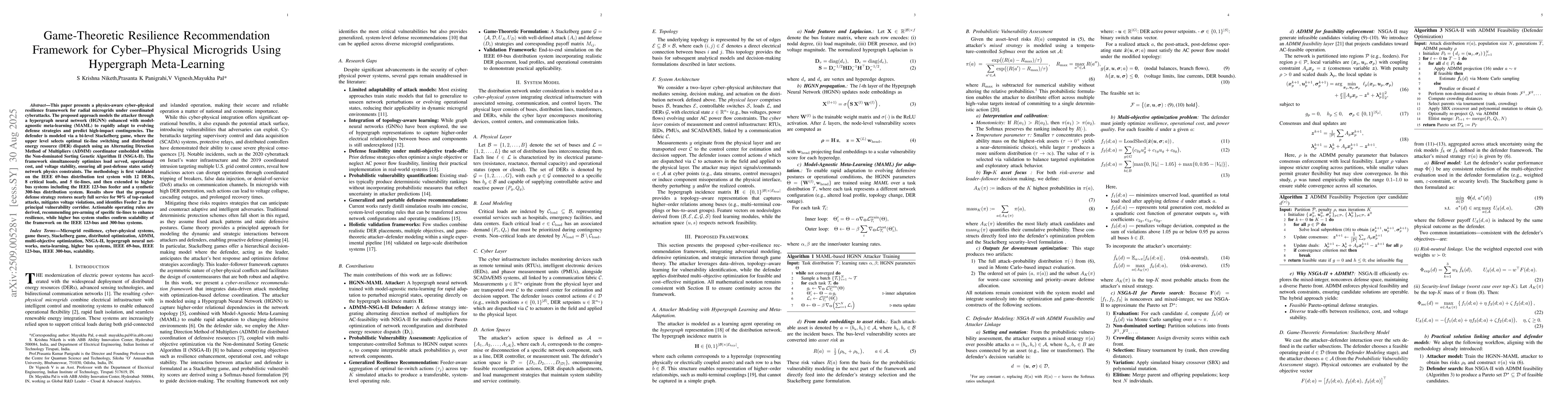This paper presents a physics-aware cyberphysical resilience framework for radial microgrids under coordinated cyberattacks. The proposed approach models the attacker through a hypergraph neural network (HGNN) enhanced with model agnostic metalearning (MAML) to rapidly adapt to evolving defense strategies and predict high-impact contingencies. The defender is modeled via a bi-level Stackelberg game, where the upper level selects optimal tie-line switching and distributed energy resource (DER) dispatch using an Alternating Direction Method of Multipliers (ADMM) coordinator embedded within the Non-dominated Sorting Genetic Algorithm II (NSGA-II). The framework simultaneously optimizes load served, operational cost, and voltage stability, ensuring all post-defense states satisfy network physics constraints. The methodology is first validated on the IEEE 69-bus distribution test system with 12 DERs, 8 critical loads, and 5 tie-lines, and then extended to higher bus systems including the IEEE 123-bus feeder and a synthetic 300-bus distribution system. Results show that the proposed defense strategy restores nearly full service for 90% of top-ranked attacks, mitigates voltage violations, and identifies Feeder 2 as the principal vulnerability corridor. Actionable operating rules are derived, recommending pre-arming of specific tie-lines to enhance resilience, while higher bus system studies confirm scalability of the framework on the IEEE 123-bus and 300-bus systems.