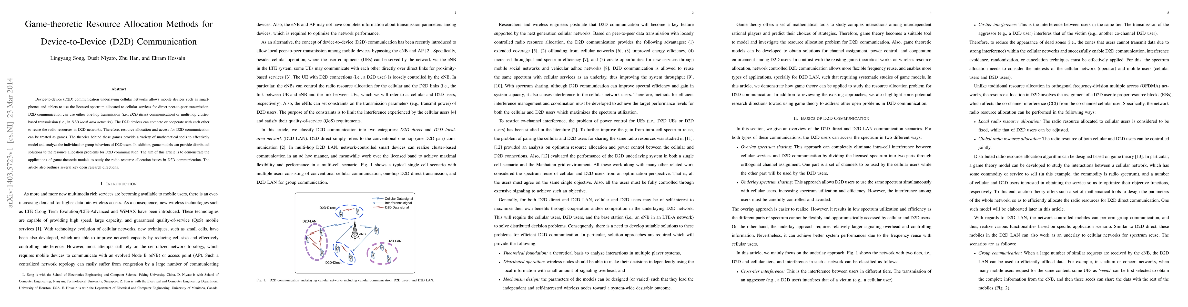 This paper explores game-theoretic methods for resource allocation in Device-to-Device (D2D) communication, highlighting how D2D devices can compete or cooperate to reuse radio resources. It demonstrates the application of game theory to model and solve D2D resource allocation problems, and identifies key open research directions.