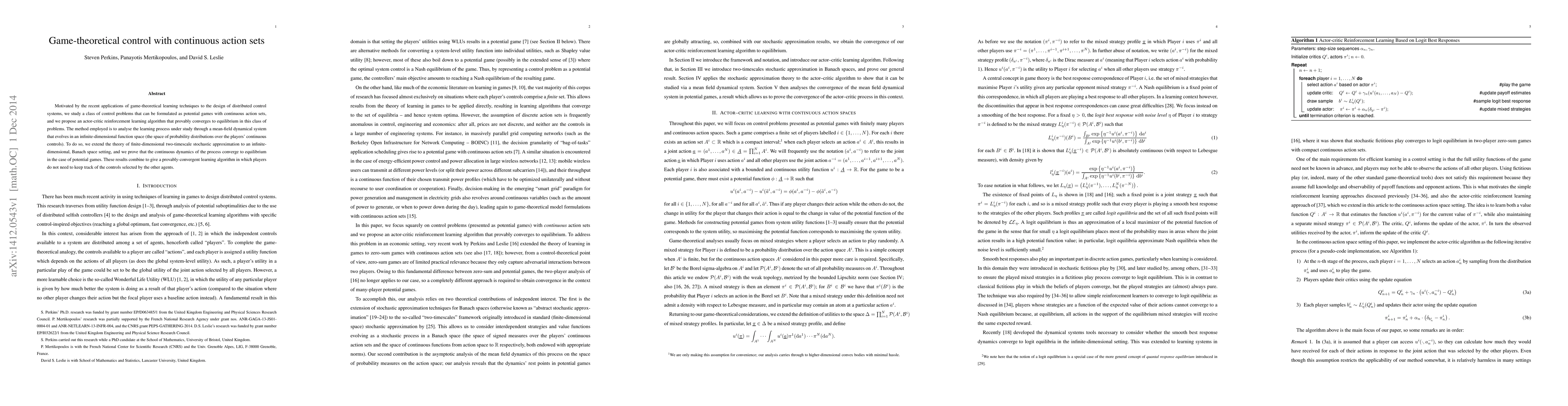 Motivated by the recent applications of game-theoretical learning techniques to the design of distributed control systems, we study a class of control problems that can be formulated as potential games with continuous action sets, and we propose an actor-critic reinforcement learning algorithm that provably converges to equilibrium in this class of problems. The method employed is to analyse the learning process under study through a mean-field dynamical system that evolves in an infinite-dimensional function space (the space of probability distributions over the players' continuous controls). To do so, we extend the theory of finite-dimensional two-timescale stochastic approximation to an infinite-dimensional, Banach space setting, and we prove that the continuous dynamics of the process converge to equilibrium in the case of potential games. These results combine to give a provably-convergent learning algorithm in which players do not need to keep track of the controls selected by the other agents.