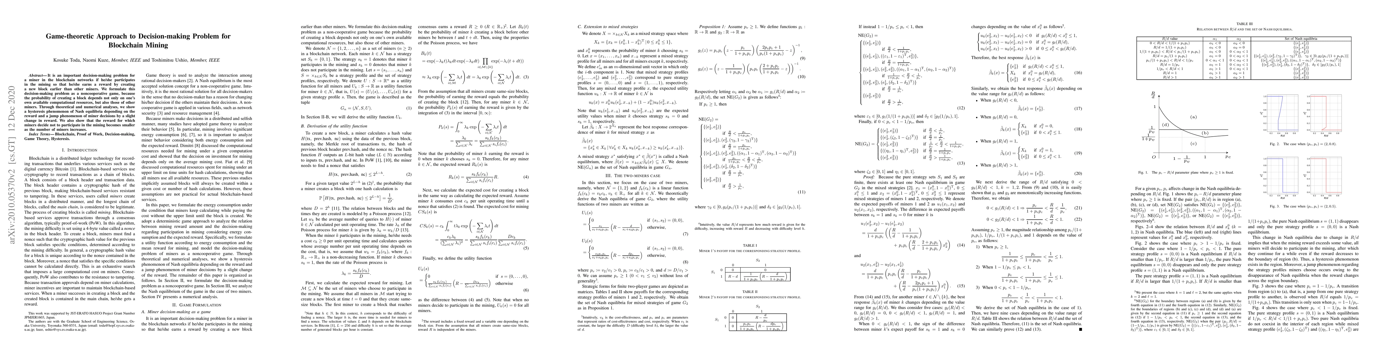 It is an important decision-making problem for a miner in the blockchain networks if he/she participates in the mining so that he/she earns a reward by creating a new block earlier than other miners. We formulate this decision-making problem as a noncooperative game, because the probability of creating a block depends not only on one's own available computational resources, but also those of other miners. Through theoretical and numerical analyses, we show a hysteresis phenomenon of Nash equilibria depending on the reward and a jump phenomenon of miner decisions by a slight change in reward. We also show that the reward for which miners decide not to participate in the mining becomes smaller as the number of miners increases.