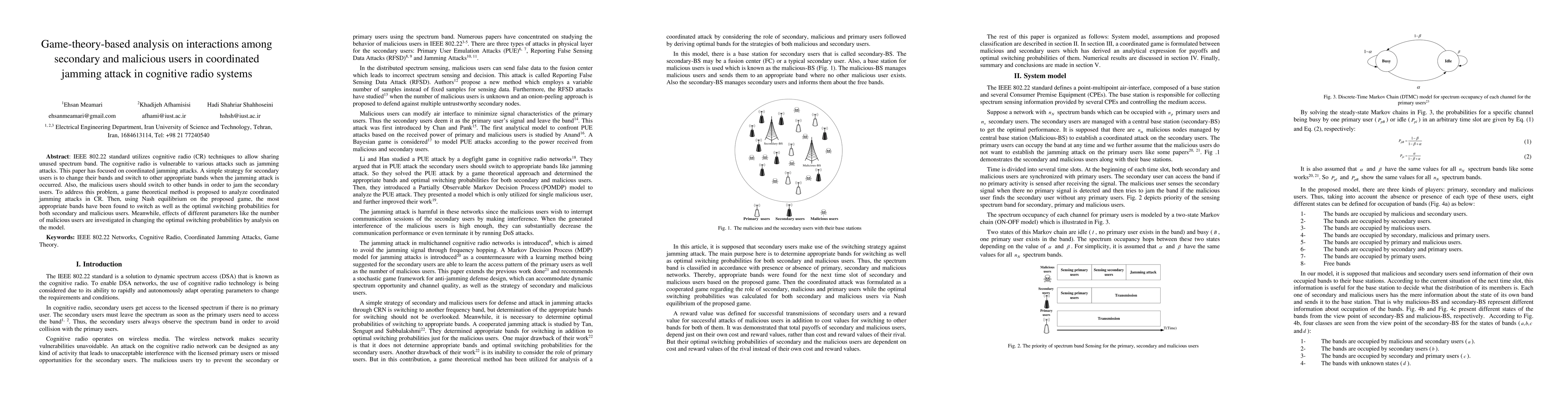 This paper proposes a game-theory-based method to analyze coordinated jamming attacks in cognitive radio systems, focusing on the interactions among secondary and malicious users. It determines optimal switching strategies and probabilities using Nash equilibrium to mitigate jamming attacks.