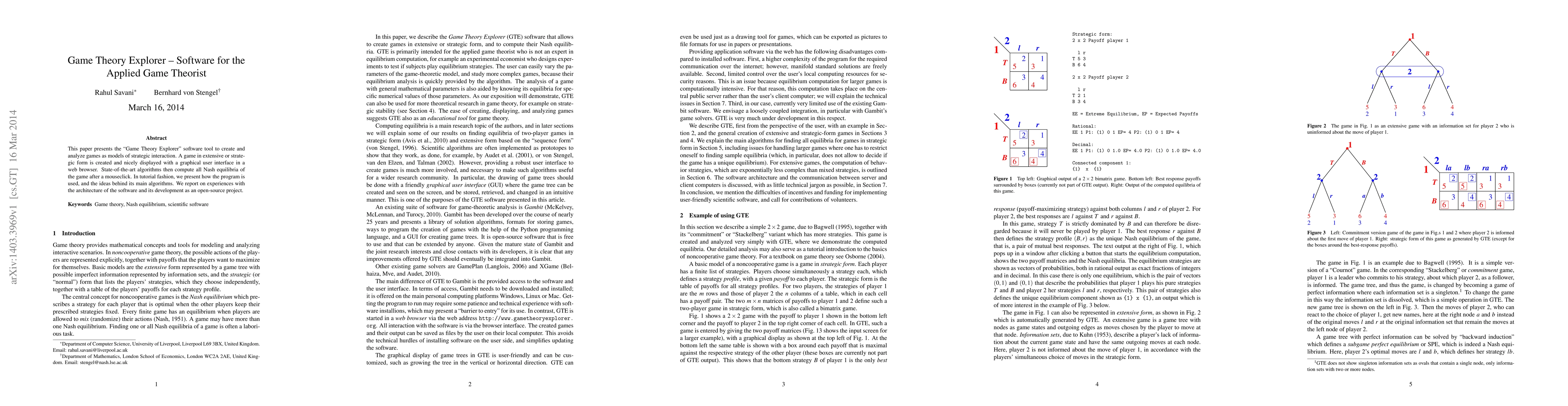 "Game Theory Explorer" is a web-based software tool for constructing and analyzing strategic games, featuring a graphical interface and algorithms to compute Nash equilibria. The paper details its usage and development as an open-source project.
