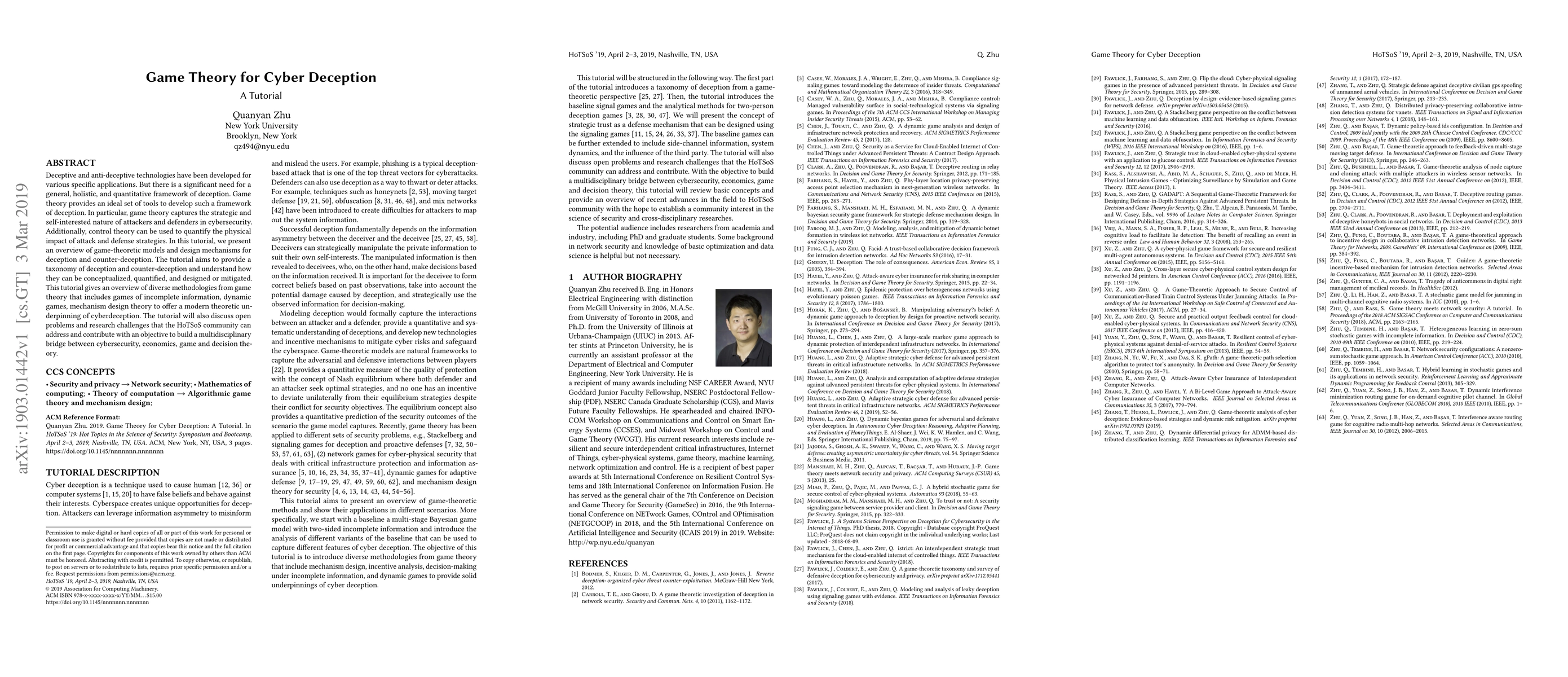This paper provides a tutorial on using game theory to develop a comprehensive framework for cyber deception, highlighting strategic interactions between attackers and defenders. It discusses various game-theoretic models and mechanisms for deception and counter-deception, aiming to bridge cybersecurity with economics, game, and decision theory.