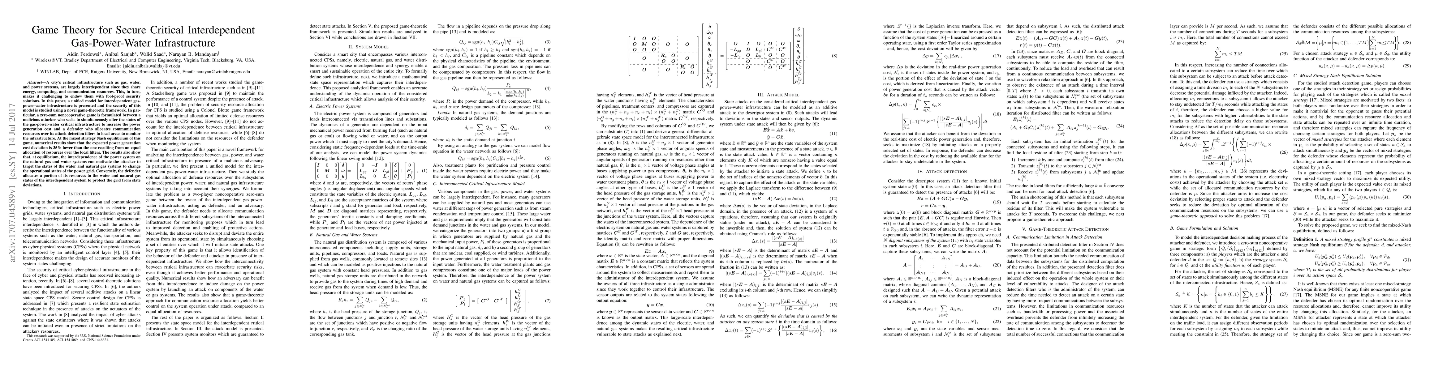 A city's critical infrastructure such as gas, water, and power systems, are largely interdependent since they share energy, computing, and communication resources. This, in turn, makes it challenging to endow them with fool-proof security solutions. In this paper, a unified model for interdependent gas-power-water infrastructure is presented and the security of this model is studied using a novel game-theoretic framework. In particular, a zero-sum noncooperative game is formulated between a malicious attacker who seeks to simultaneously alter the states of the gas-power-water critical infrastructure to increase the power generation cost and a defender who allocates communication resources over its attack detection filters in local areas to monitor the infrastructure. At the mixed strategy Nash equilibrium of this game, numerical results show that the expected power generation cost deviation is 35\% lower than the one resulting from an equal allocation of resources over the local filters. The results also show that, at equilibrium, the interdependence of the power system on the natural gas and water systems can motivate the attacker to target the states of the water and natural gas systems to change the operational states of the power grid. Conversely, the defender allocates a portion of its resources to the water and natural gas states of the interdependent system to protect the grid from state deviations.
