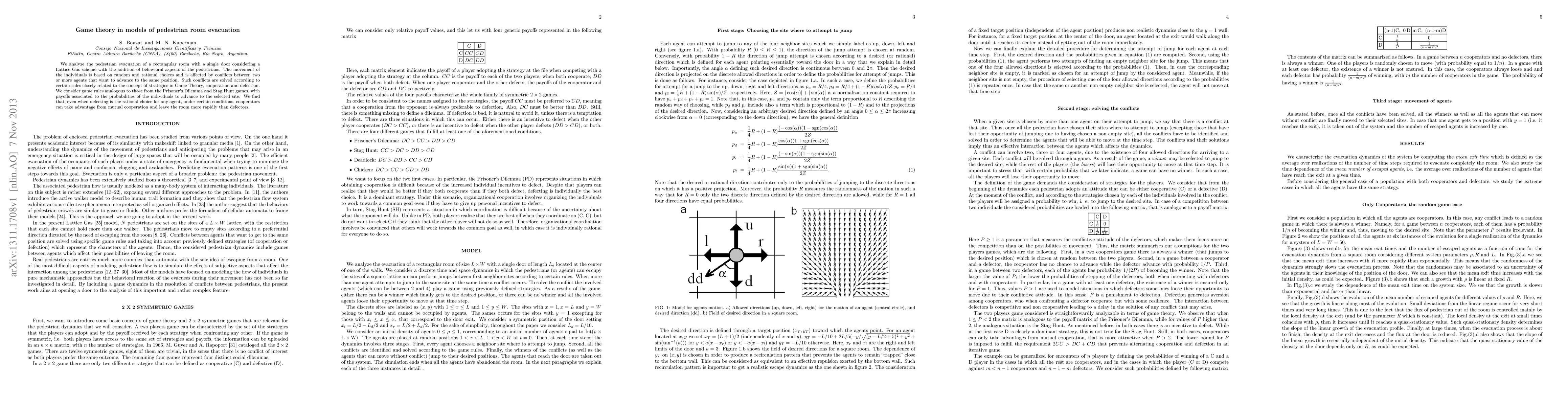 Researchers studied pedestrian evacuation in a room using game theory, finding that cooperation can lead to faster escape times even when defecting is the rational choice, highlighting the importance of strategic behavior in emergency situations.
