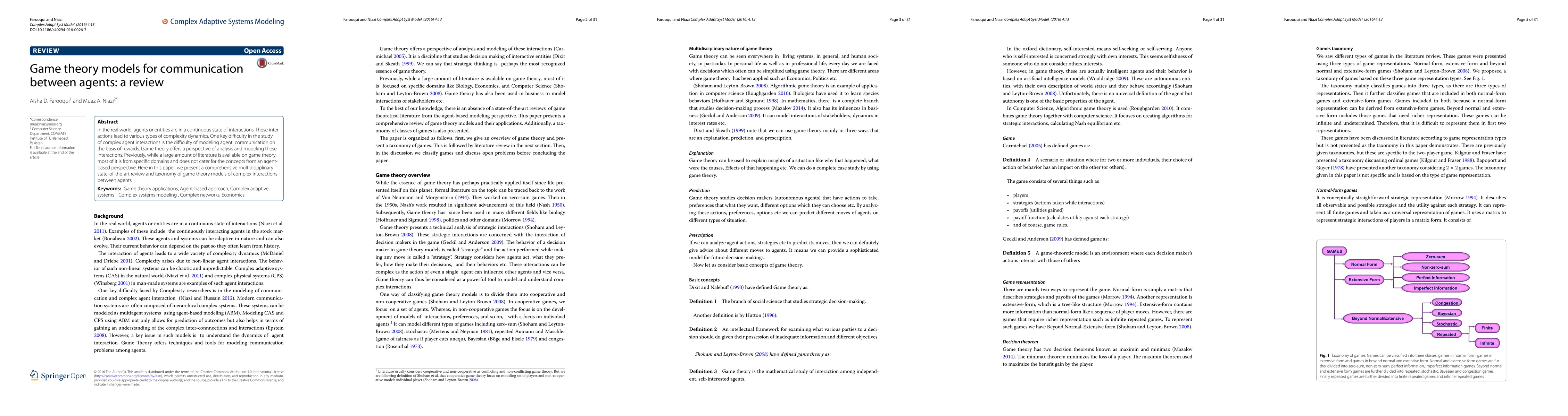 This paper reviews game theory models for analyzing complex interactions between agents, providing a comprehensive taxonomy and highlighting the challenges in modeling agent communication based on rewards from an agent-based perspective. It aims to bridge domain-specific literature with a multidisciplinary approach.