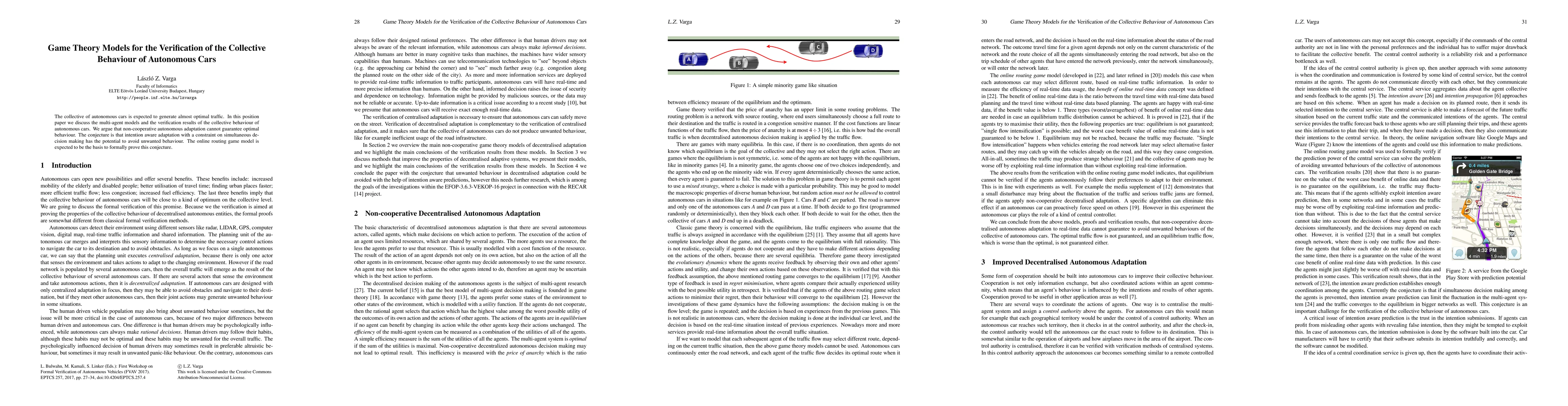 The collective of autonomous cars is expected to generate almost optimal traffic. In this position paper we discuss the multi-agent models and the verification results of the collective behaviour of autonomous cars. We argue that non-cooperative autonomous adaptation cannot guarantee optimal behaviour. The conjecture is that intention aware adaptation with a constraint on simultaneous decision making has the potential to avoid unwanted behaviour. The online routing game model is expected to be the basis to formally prove this conjecture.