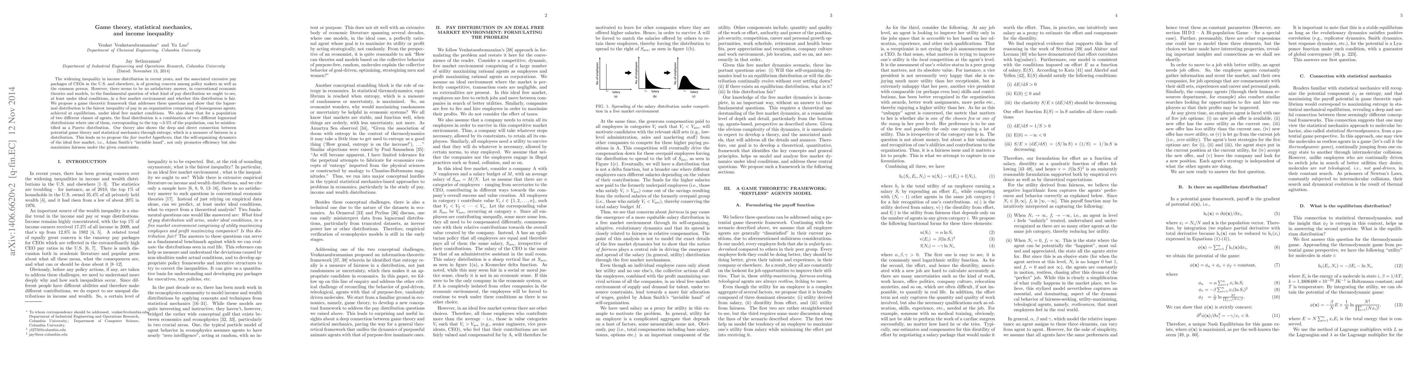 This paper proposes a game theoretic framework to address income inequality, demonstrating that the lognormal distribution represents the fairest pay distribution in a homogenous free market. It also connects potential game theory to statistical mechanics via entropy, suggesting that the ideal free market promotes both efficiency and fairness.
