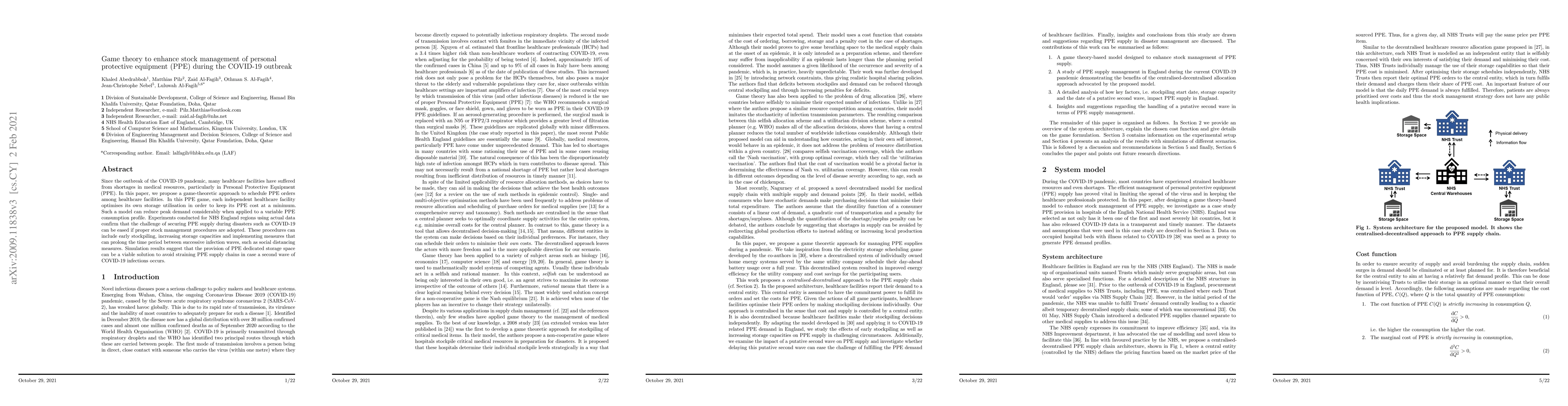 This paper proposes a game-theoretic approach to optimize PPE stock management among healthcare facilities during the COVID-19 pandemic, aiming to reduce costs and peak demand. Simulation results using NHS England data suggest that dedicated storage and stockpiling can mitigate supply strain during future infection waves.