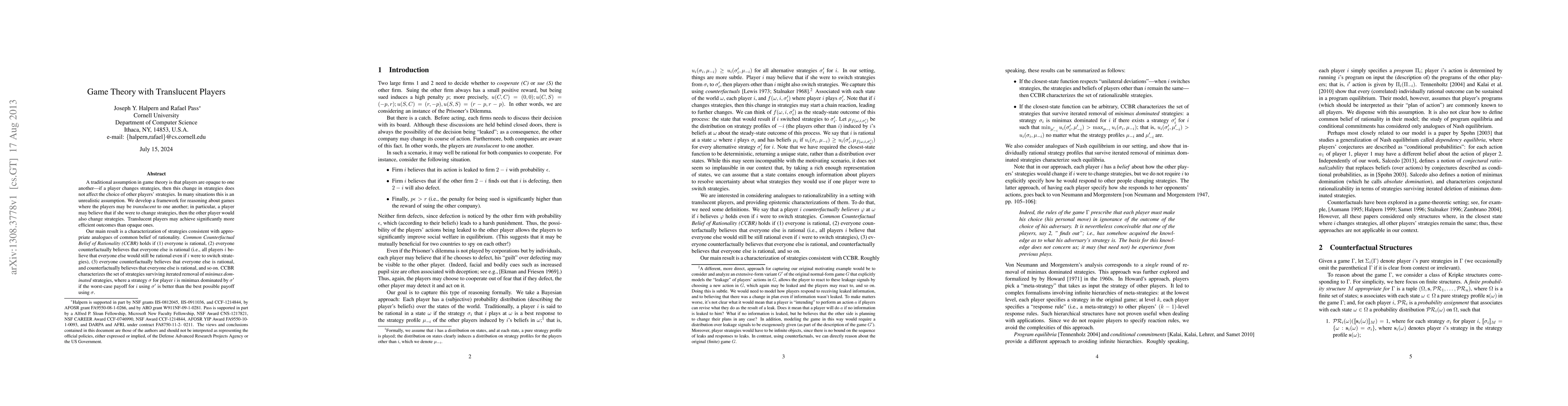 This paper introduces a game theory framework where players can be translucent, meaning they believe changes in their strategies might affect others' strategies. The authors characterize strategies under Common Counterfactual Belief of Rationality (CCBR), which iteratively removes minimax dominated strategies, potentially leading to more efficient outcomes compared to opaque player models.