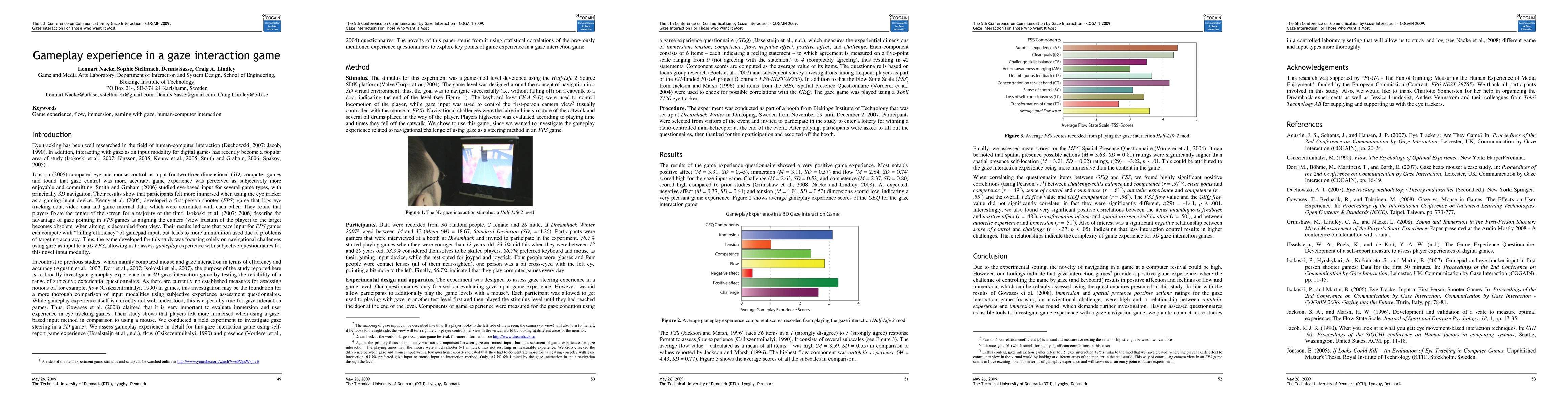Assessing gameplay experience for gaze interaction games is a challenging task. For this study, a gaze interaction Half-Life 2 game modification was created that allowed eye tracking control. The mod was deployed during an experiment at Dreamhack 2007, where participants had to play with gaze navigation and afterwards rate their gameplay experience. The results show low tension and negative affects scores on the gameplay experience questionnaire as well as high positive challenge, immersion and flow ratings. The correlation between spatial presence and immersion for gaze interaction was high and yields further investigation. It is concluded that gameplay experience can be correctly assessed with the methodology presented in this paper.