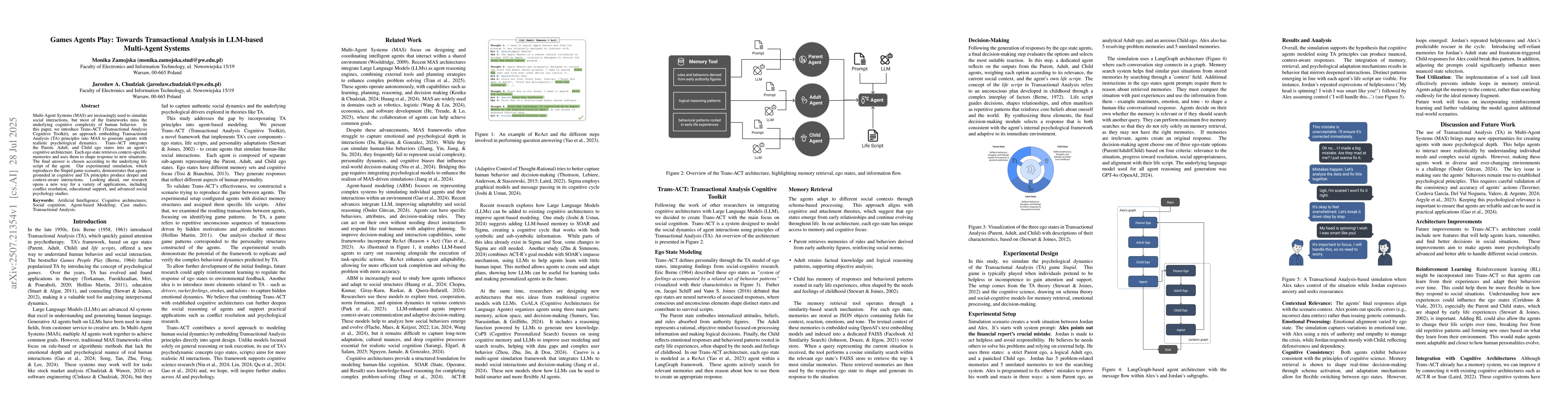 Multi-Agent Systems (MAS) are increasingly used to simulate social interactions, but most of the frameworks miss the underlying cognitive complexity of human behavior. In this paper, we introduce Trans-ACT (Transactional Analysis Cognitive Toolkit), an approach embedding Transactional Analysis (TA) principles into MAS to generate agents with realistic psychological dynamics. Trans-ACT integrates the Parent, Adult, and Child ego states into an agent's cognitive architecture. Each ego state retrieves context-specific memories and uses them to shape response to new situations. The final answer is chosen according to the underlying life script of the agent. Our experimental simulation, which reproduces the Stupid game scenario, demonstrates that agents grounded in cognitive and TA principles produce deeper and context-aware interactions. Looking ahead, our research opens a new way for a variety of applications, including conflict resolution, educational support, and advanced social psychology studies.