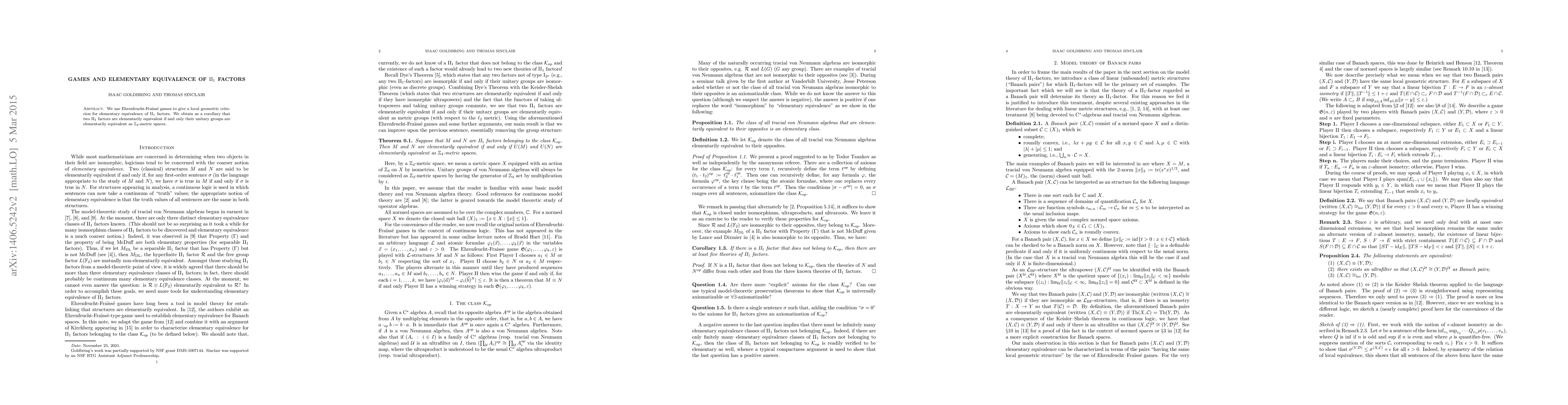 We use Ehrenfeucht-Fra\"iss\'e games to give a local geometric criterion for elementary equivalence of II$_1$ factors. We obtain as a corollary that two II$_1$ factors are elementarily equivalent if and only their unitary groups are elementarily equivalent as $\mathbb Z_4$-metric spaces.