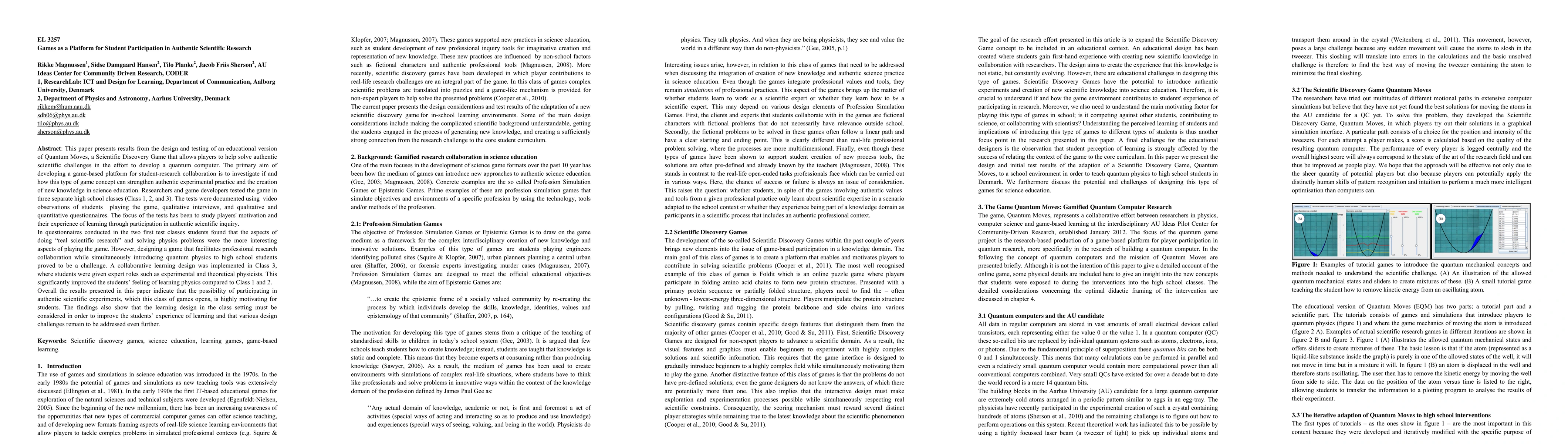 This paper presents results from the design and testing of an educational version of Quantum Moves, a Scientific Discovery Game that allows players to help solve authentic scientific challenges in the effort to develop a quantum computer. The primary aim of developing a game-based platform for student-research collaboration is to investigate if and how this type of game concept can strengthen authentic experimental practice and the creation of new knowledge in science education. Researchers and game developers tested the game in three separate high school classes. The tests were documented using video observations of students playing the game, qualitative interviews, and qualitative and quantitative questionnaires. The focus of the tests has been to study players motivation and their experience of learning through participation in authentic scientific inquiry. In questionnaires conducted in the two first test classes students found that the aspects of doing real scientific research and solving physics problems were the more interesting aspects of playing the game. However, designing a game that facilitates professional research collaboration while simultaneously introducing quantum physics to high school students proved to be a challenge. A collaborative learning design was implemented in Class 3, where students were given expert roles such as experimental and theoretical physicists. This significantly improved the students feeling of learning physics compared to Class 1 and 2. Overall the results presented in this paper indicate that the possibility of participating in authentic scientific experiments, which this class of games opens, is highly motivating for students. The findings also show that the learning design in the class setting must be considered in order to improve the students' experience of learning and that various design challenges remain to be addressed further.