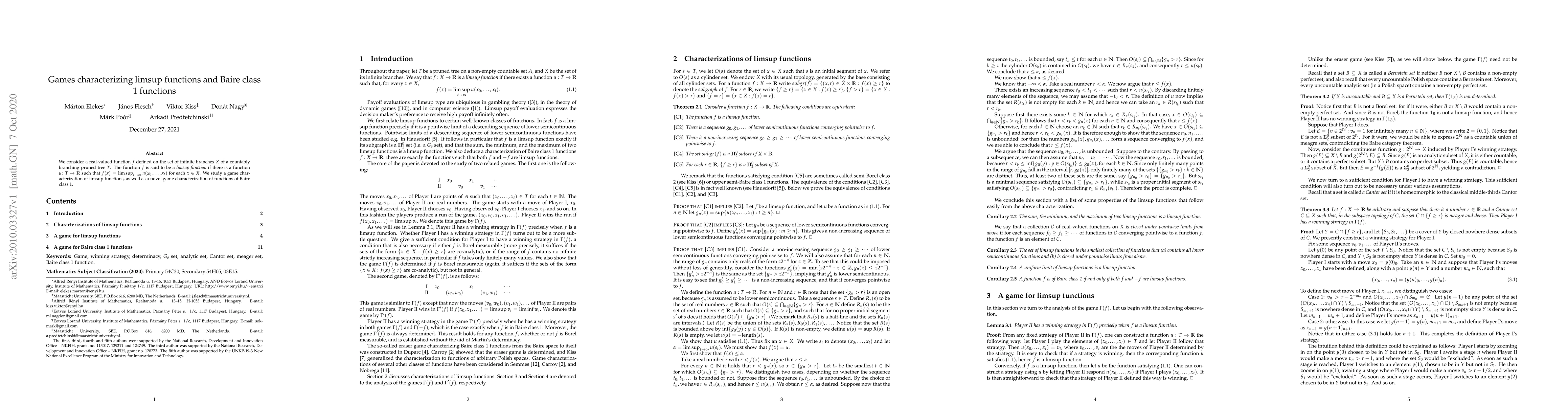 This paper explores game characterizations for limsup functions defined on infinite branches of a pruned tree, and introduces a new game framework for functions of Baire class 1. The study connects these functions with strategic interactions in games.