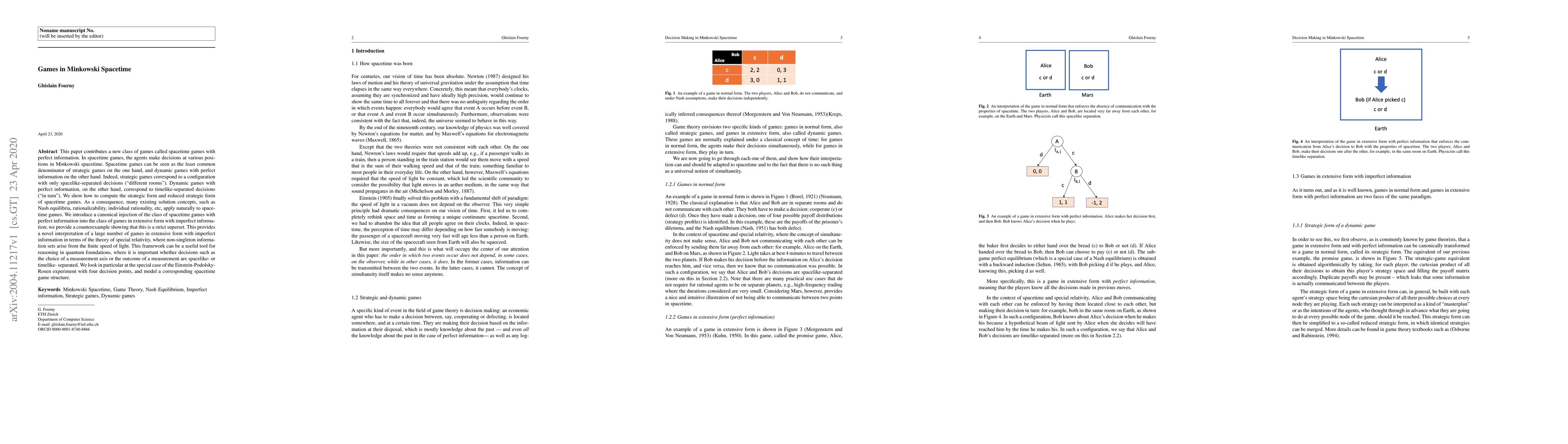 This paper contributes a new class of games called spacetime games with perfect information. In spacetime games, the agents make decisions at various positions in Minkowski spacetime. Spacetime games can be seen as the least common denominator of strategic games on the one hand, and dynamic games with perfect information on the other hand. Indeed, strategic games correspond to a configuration with only spacelike-separated decisions ("different rooms"). Dynamic games with perfect information, on the other hand, correspond to timelike-separated decisions ("in turn"). We show how to compute the strategic form and reduced strategic form of spacetime games. As a consequence, many existing solution concepts, such as Nash equilibria, rationalizability, individual rationality, etc, apply naturally to spacetime games. We introduce a canonical injection of the class of spacetime games with perfect information into the class of games in extensive form with imperfect information; we provide a counterexample showing that this is a strict superset. This provides a novel interpretation of a large number of games in extensive form with imperfect information in terms of the theory of special relativity, where non-singleton information sets arise from the finite speed of light. This framework can be a useful tool for reasoning in quantum foundations, where it is important whether decisions such as the choice of a measurement axis or the outcome of a measurement are spacelike- or timelike- separated. We look in particular at the special case of the Einstein-Podolsky-Rosen experiment with four decision points, and model a corresponding spacetime game structure.