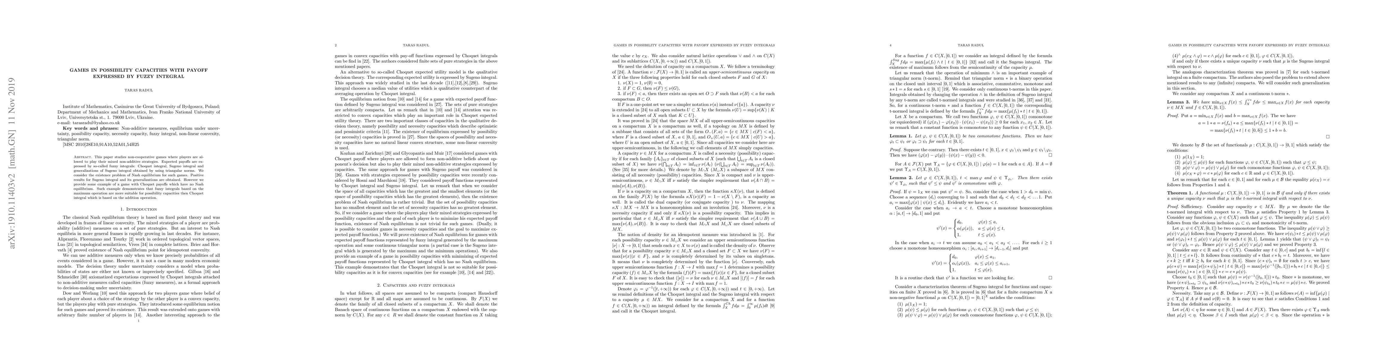This paper explores non-cooperative games with mixed strategies where payoffs are determined using fuzzy integrals, specifically Choquet, Sugeno, and their generalizations. It addresses the existence of Nash equilibrium, finding Sugeno integrals suitable for possibility capacities but highlighting that Choquet integrals lack equilibrium in some scenarios.