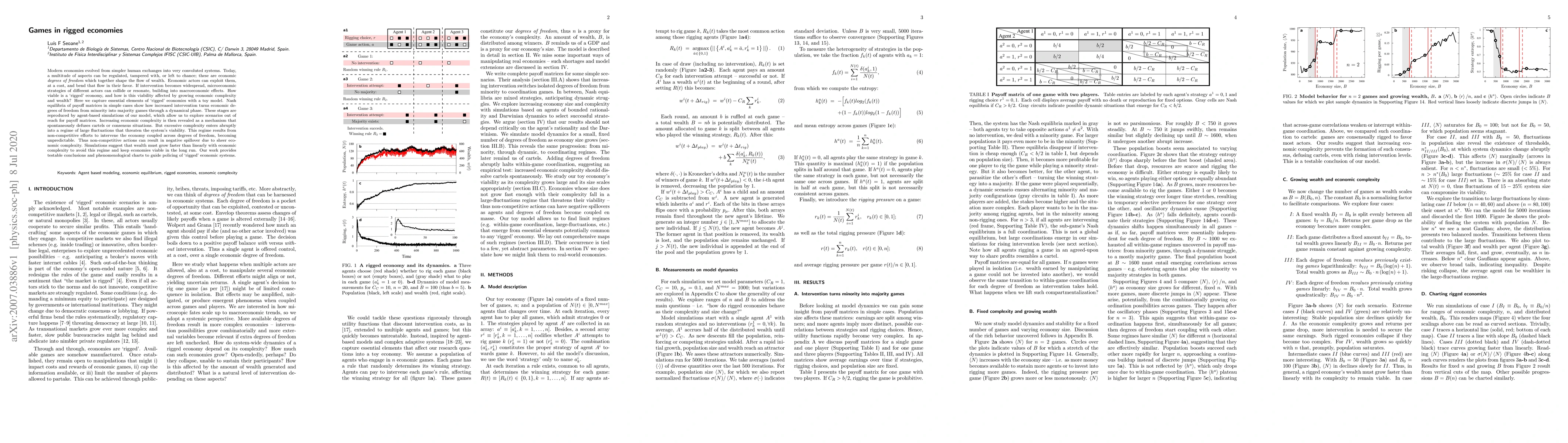 Modern economies evolved from simpler human exchanges into very convoluted systems. Today, a multitude of aspects can be regulated, tampered with, or left to chance; these are economic {\em degrees of freedom} which together shape the flow of wealth. Economic actors can exploit them, at a cost, and bend that flow in their favor. If intervention becomes widespread, microeconomic strategies of different actors can collide or resonate, building into macroeconomic effects. How viable is a `rigged' economy, and how is this viability affected by growing economic complexity and wealth? Here we capture essential elements of `rigged' economies with a toy model. Nash equilibria of payoff matrices in simple cases show how increased intervention turns economic degrees of freedom from minority into majority games through a dynamical phase. These stages are reproduced by agent-based simulations of our model, which allow us to explore scenarios out of reach for payoff matrices. Increasing economic complexity is then revealed as a mechanism that spontaneously defuses cartels or consensus situations. But excessive complexity enters abruptly into a regime of large fluctuations that threaten the system's viability. This regime results from non-competitive efforts to intervene the economy coupled across degrees of freedom, becoming unpredictable. Thus non-competitive actions can result in negative spillover due to sheer economic complexity. Simulations suggest that wealth must grow faster than linearly with economic complexity to avoid this regime and keep economies viable in the long run. Our work provides testable conclusions and phenomenological charts to guide policing of `rigged' economic systems.