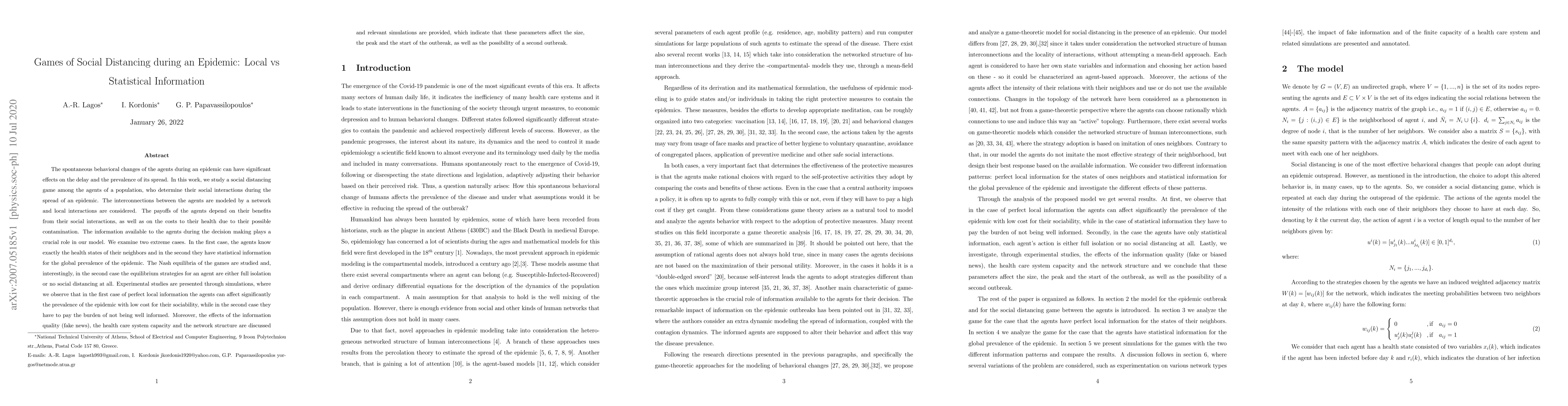 The spontaneous behavioral changes of the agents during an epidemic can have significant effects on the delay and the prevalence of its spread. In this work, we study a social distancing game among the agents of a population, who determine their social interactions during the spread of an epidemic. The interconnections between the agents are modeled by a network and local interactions are considered. The payoffs of the agents depend on their benefits from their social interactions, as well as on the costs to their health due to their possible contamination. The information available to the agents during the decision making plays a crucial role in our model. We examine two extreme cases. In the first case, the agents know exactly the health states of their neighbors and in the second they have statistical information for the global prevalence of the epidemic. The Nash equilibria of the games are studied and, interestingly, in the second case the equilibrium strategies for an agent are either full isolation or no social distancing at all. Experimental studies are presented through simulations, where we observe that in the first case of perfect local information the agents can affect significantly the prevalence of the epidemic with low cost for their sociability, while in the second case they have to pay the burden of not being well informed. Moreover, the effects of the information quality (fake news), the health care system capacity and the network structure are discussed and relevant simulations are provided, which indicate that these parameters affect the size, the peak and the start of the outbreak, as well as the possibility of a second outbreak.