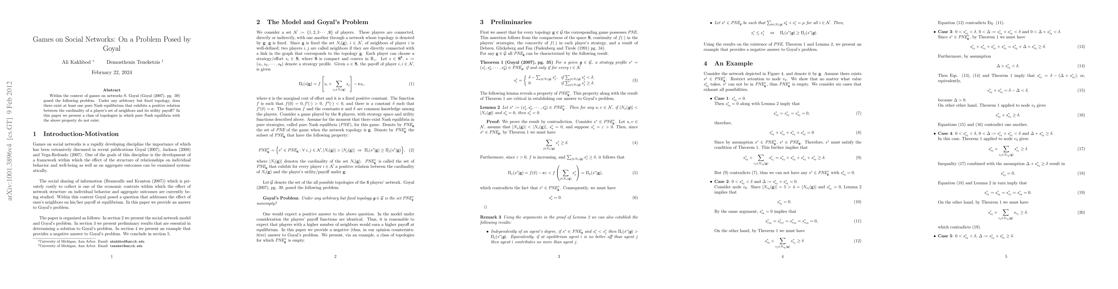 This paper addresses Goyal's problem regarding the existence of pure Nash equilibria where utility payoffs are positively related to the number of neighbors in a network. It concludes that certain network topologies and game structures do not support such equilibria.