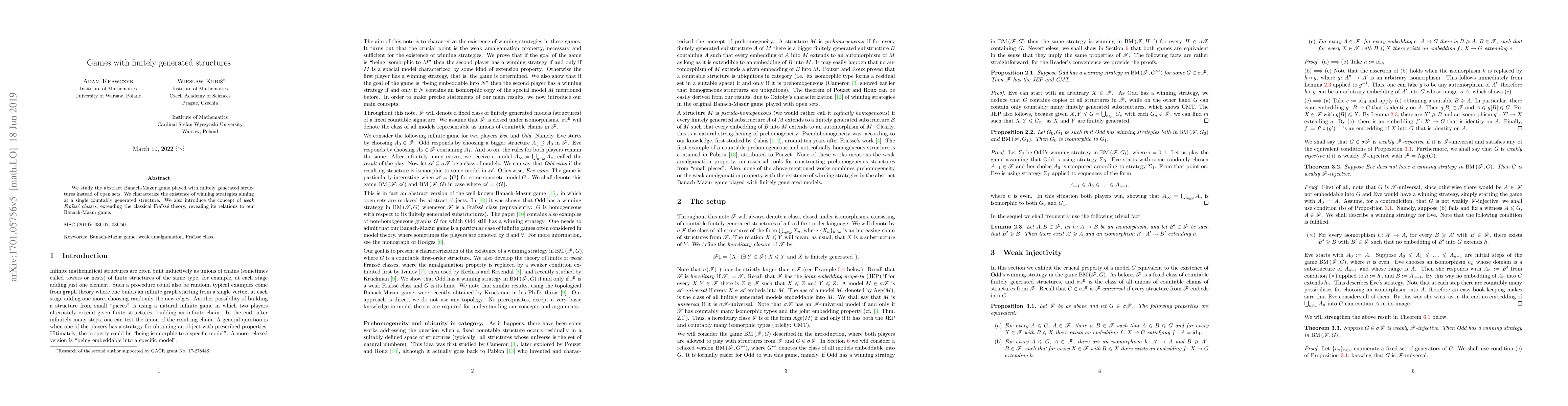 This research paper explores the Banach-Mazur game adapted for finitely generated structures, characterizing winning strategies targeting countably generated structures. It also introduces weak Fraisse classes, extending traditional Fraisse theory and linking it to the Banach-Mazur game.