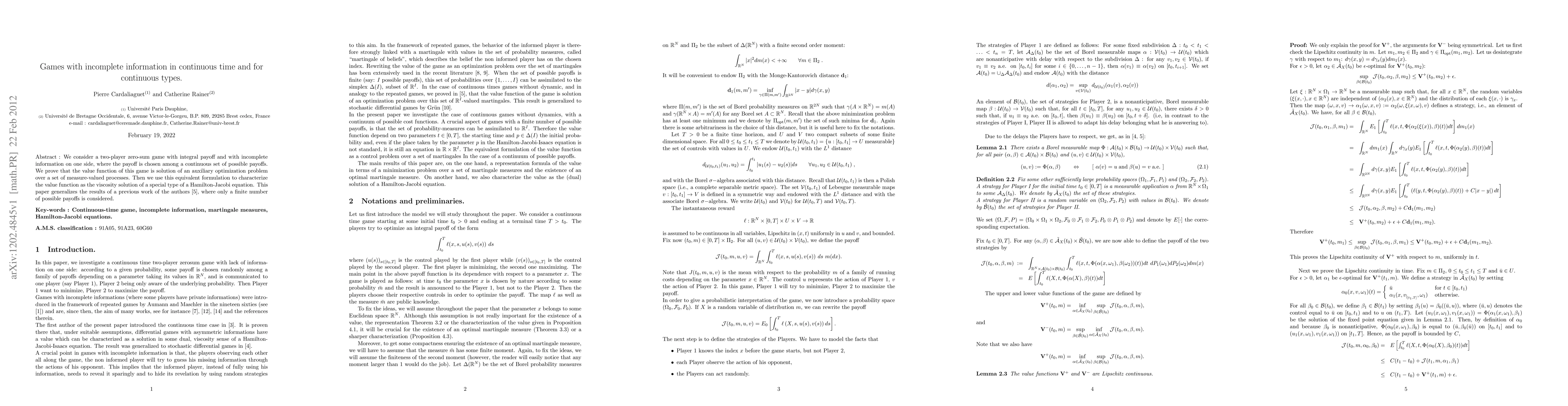 A new type of game is studied where one player has incomplete information about payoffs in continuous time, generalizing a previous work to continuous types. The value function is characterized as the solution of a special Hamilton-Jacobi equation, offering insights into optimizing behavior under uncertainty.