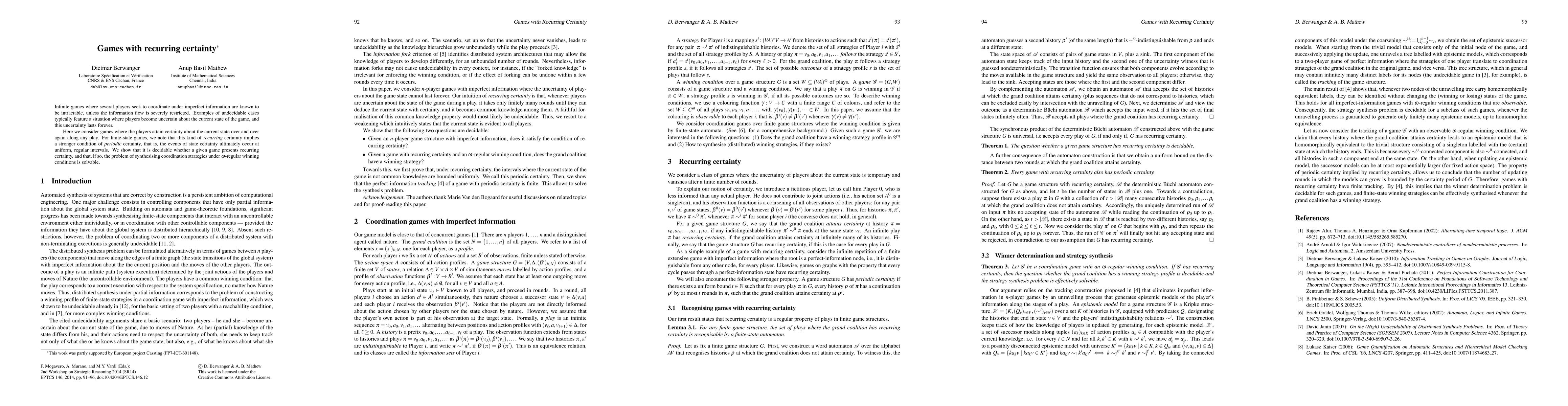 Infinite games where several players seek to coordinate under imperfect information are known to be intractable, unless the information flow is severely restricted. Examples of undecidable cases typically feature a situation where players become uncertain about the current state of the game, and this uncertainty lasts forever. Here we consider games where the players attain certainty about the current state over and over again along any play. For finite-state games, we note that this kind of recurring certainty implies a stronger condition of periodic certainty, that is, the events of state certainty ultimately occur at uniform, regular intervals. We show that it is decidable whether a given game presents recurring certainty, and that, if so, the problem of synthesising coordination strategies under w-regular winning conditions is solvable.