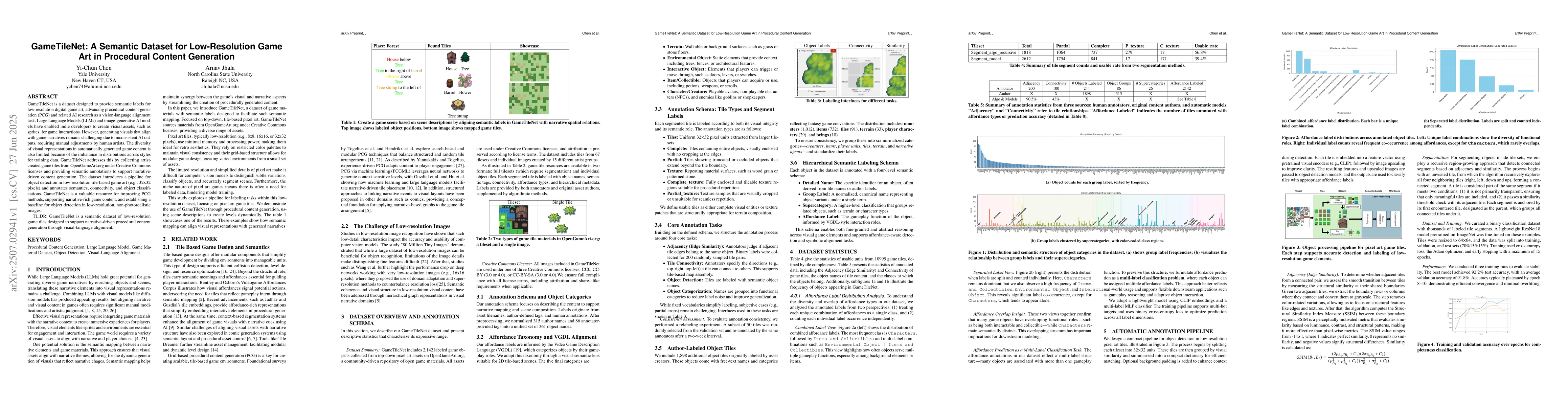 GameTileNet is a dataset designed to provide semantic labels for low-resolution digital game art, advancing procedural content generation (PCG) and related AI research as a vision-language alignment task. Large Language Models (LLMs) and image-generative AI models have enabled indie developers to create visual assets, such as sprites, for game interactions. However, generating visuals that align with game narratives remains challenging due to inconsistent AI outputs, requiring manual adjustments by human artists. The diversity of visual representations in automatically generated game content is also limited because of the imbalance in distributions across styles for training data. GameTileNet addresses this by collecting artist-created game tiles from OpenGameArt.org under Creative Commons licenses and providing semantic annotations to support narrative-driven content generation. The dataset introduces a pipeline for object detection in low-resolution tile-based game art (e.g., 32x32 pixels) and annotates semantics, connectivity, and object classifications. GameTileNet is a valuable resource for improving PCG methods, supporting narrative-rich game content, and establishing a baseline for object detection in low-resolution, non-photorealistic images. TL;DR: GameTileNet is a semantic dataset of low-resolution game tiles designed to support narrative-driven procedural content generation through visual-language alignment.