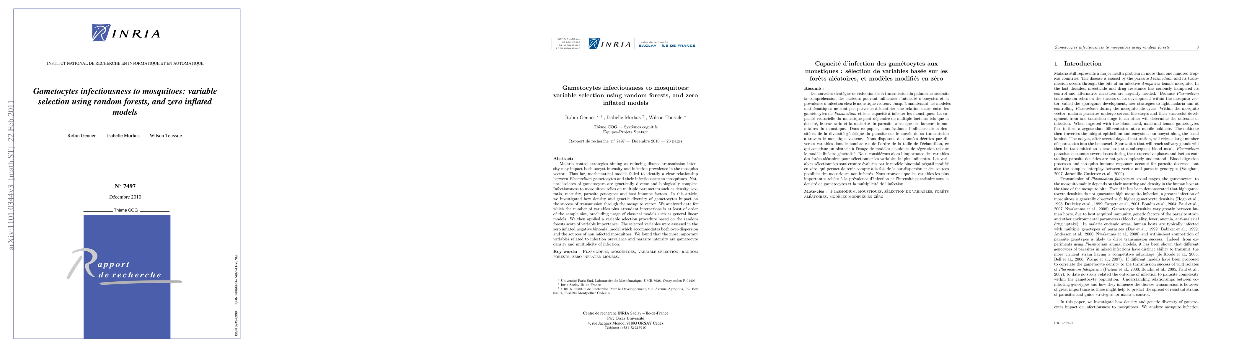 This study investigates the factors influencing the infectiousness of Plasmodium falciparum gametocytes to mosquitoes using random forests for variable selection and zero-inflated models to account for non-infected mosquitoes. Key findings highlight gametocyte density and genetic diversity as major determinants of transmission success.